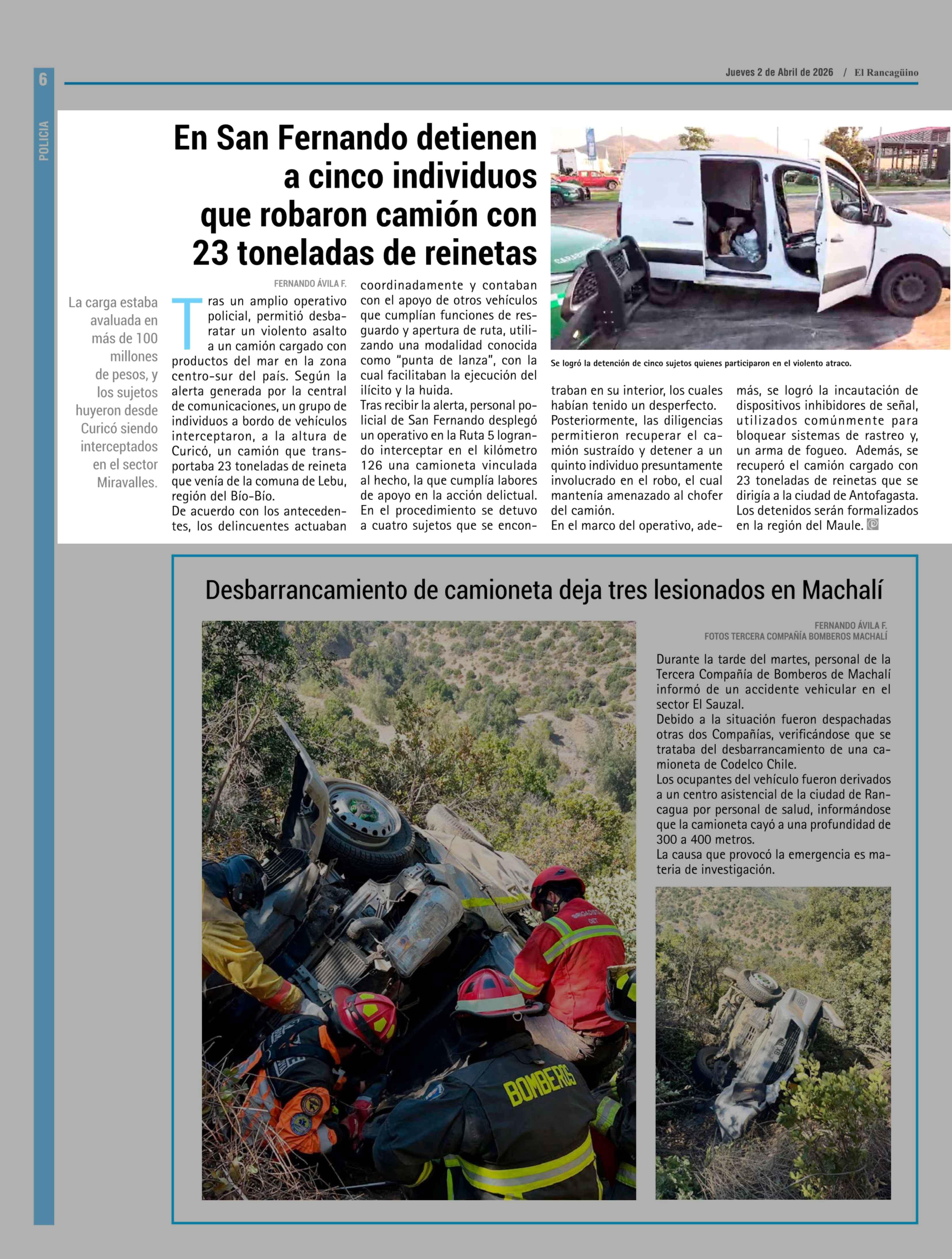 En San Fernando detienen a cinco individuos que robaron camión con 23 toneladas de reinetas 02-04-2026 El Rancagüino |
