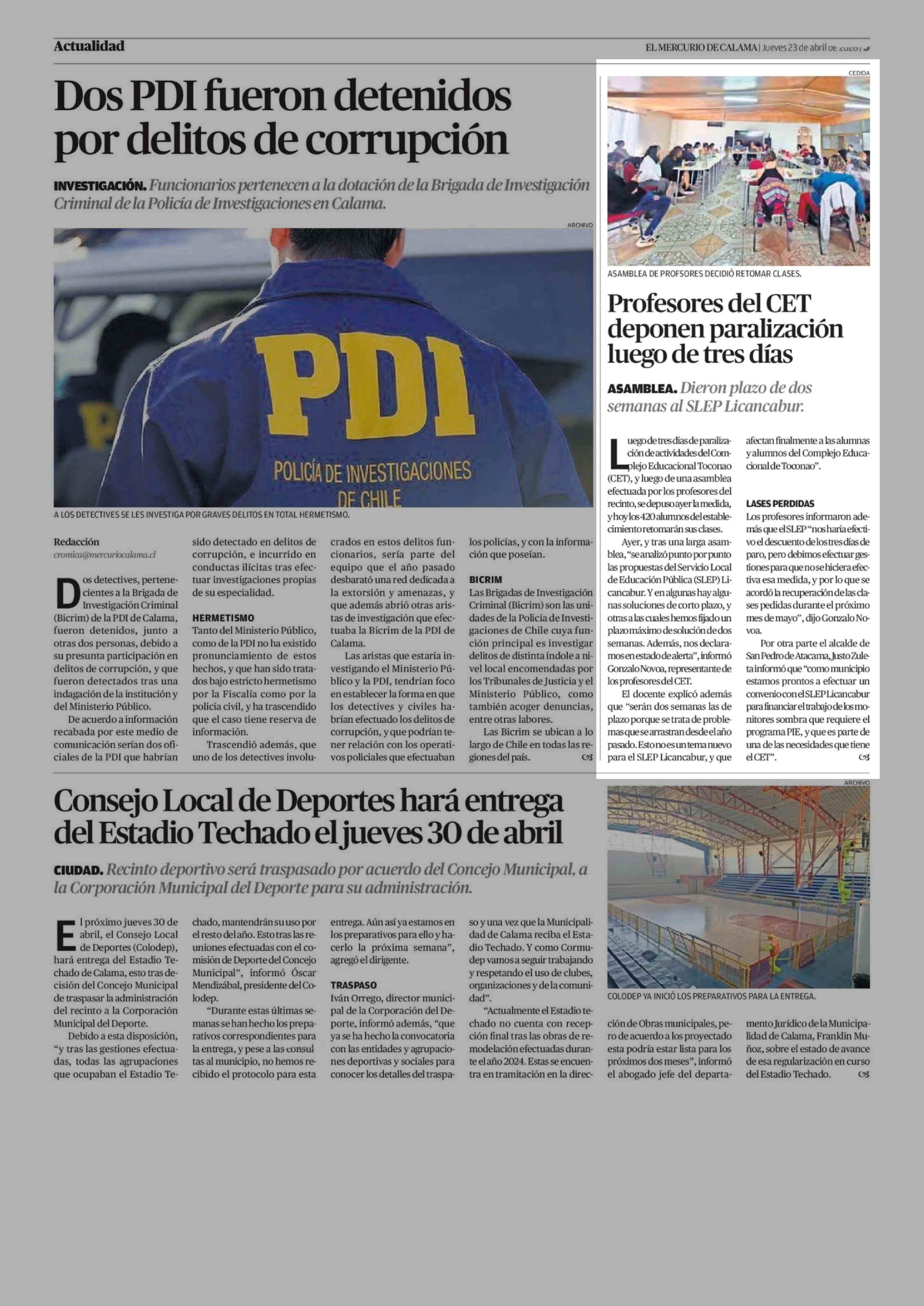 Profesores del CET deponen paralización luego de tres días 23-04-2026 El Mercurio de Calama |