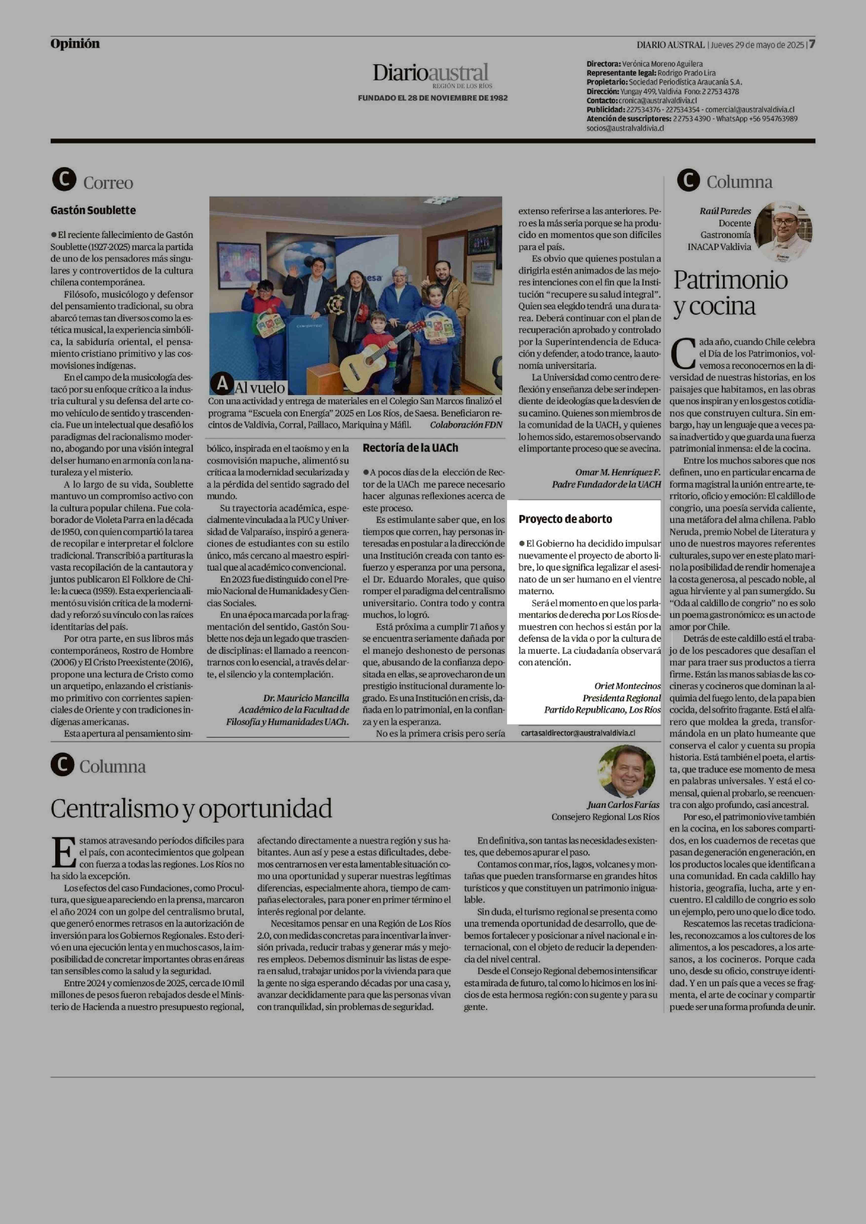 COLUMNAS DE OPINIÓN: Proyecto de aborto 29-05-2025 Diario Austral Región de Los Ríos |