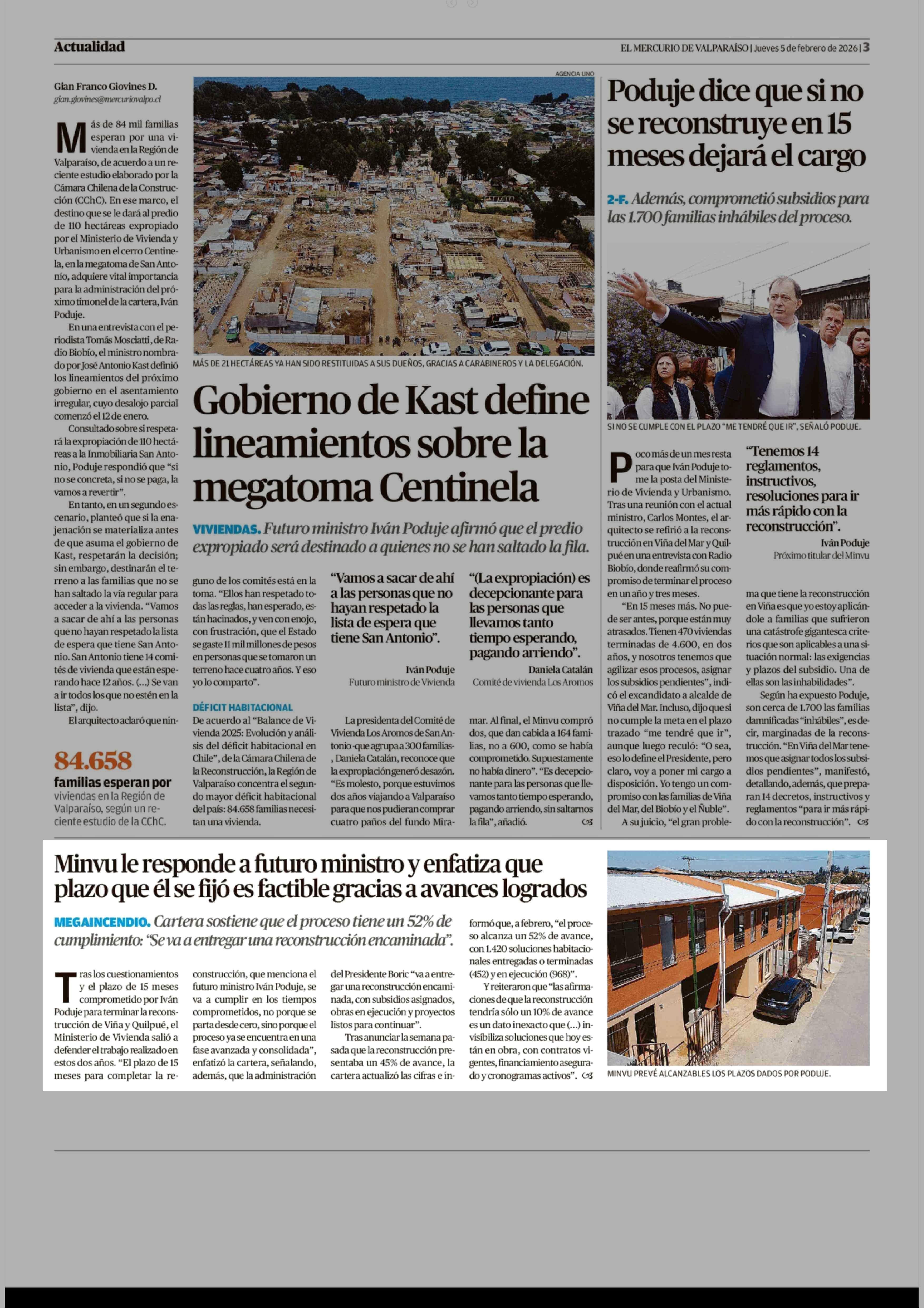 Minvu le responde a futuro ministro y enfatiza que plazo que él se fijó es factible gracias a avances logrados 05-02-2026 El Mercurio de Valparaíso |
