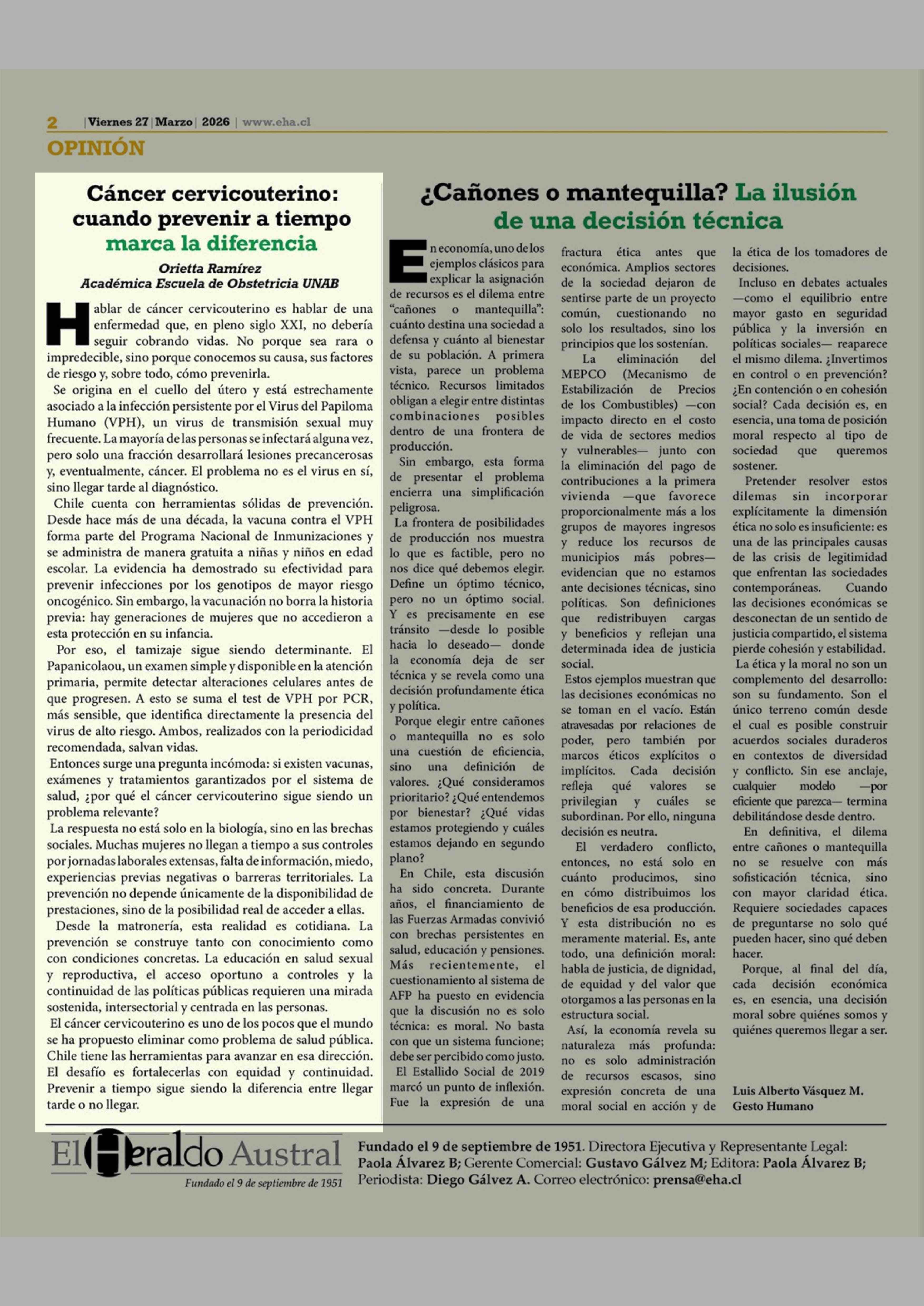 Columnas de Opinión: Cáncer cervicouterino: cuando prevenir a tiempo marca la diferencia 27-03-2026 El Heraldo Austral |