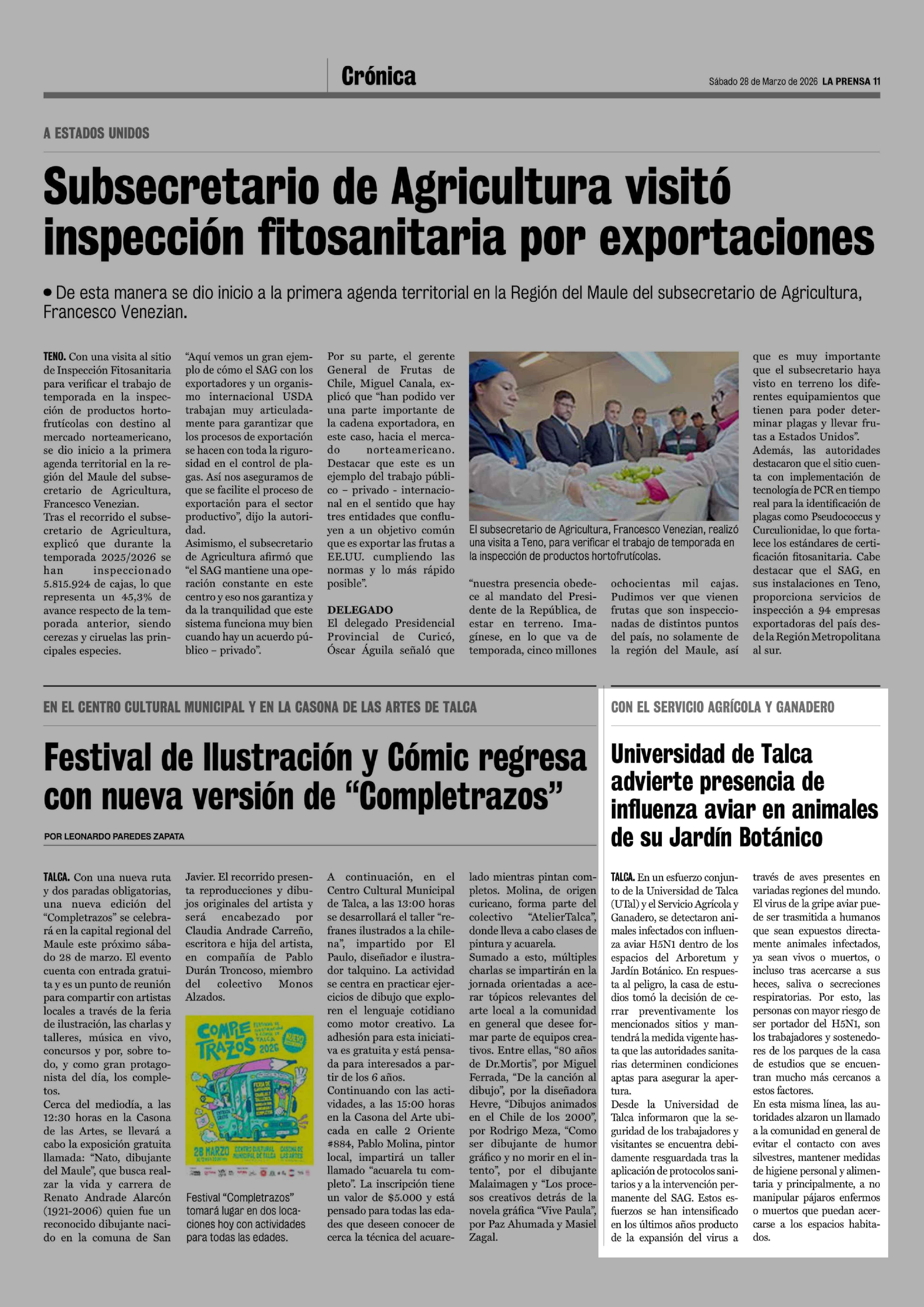 Universidad de Talca advierte presencia de influenza aviar en animales de su Jardín Botánico 28-03-2026 La Prensa de Curicó |