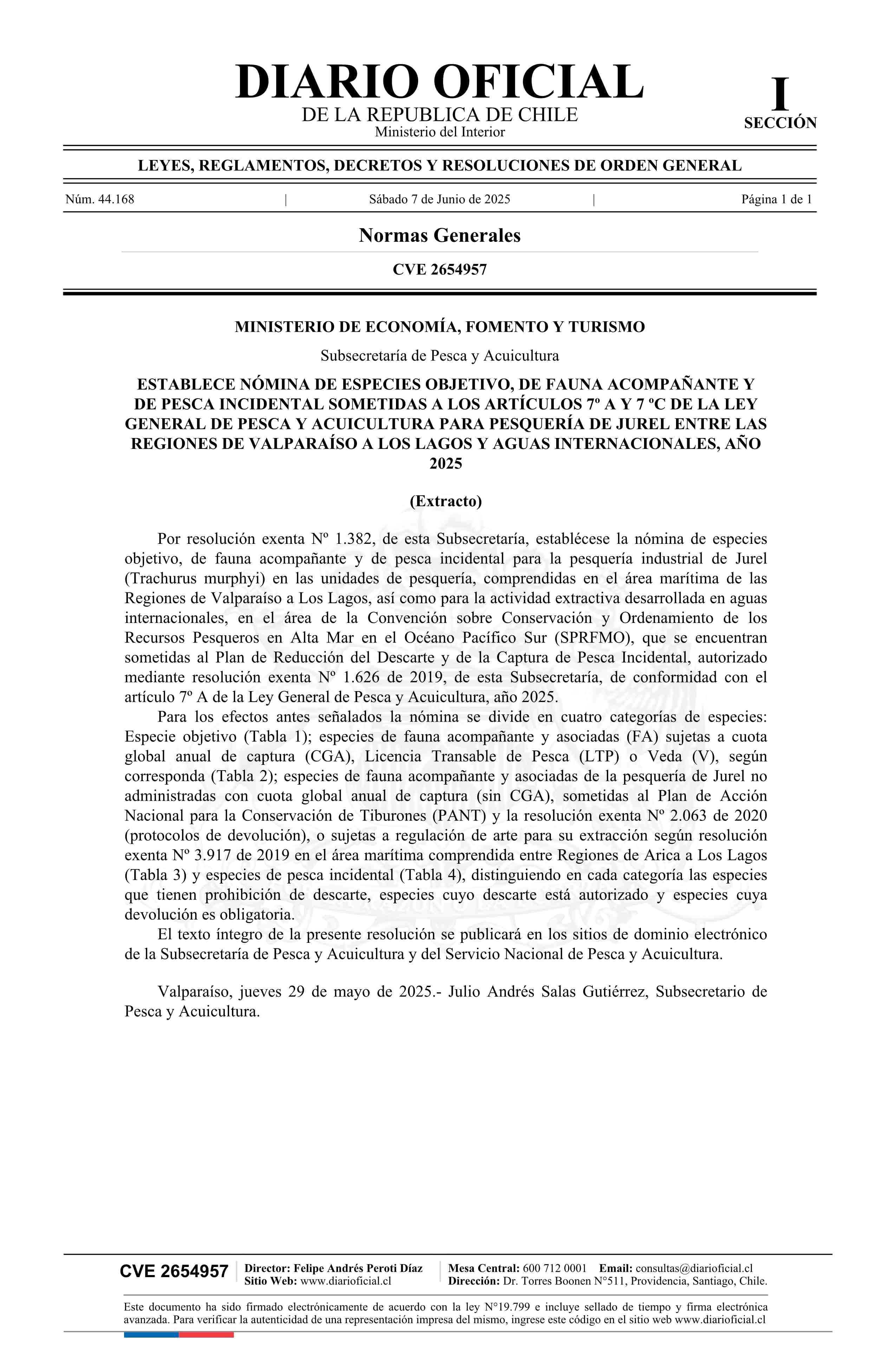 | Título: | Extracto de resolución exenta número 1.382, de 2025.- Establece nómina de especies objetivo, de fauna acompañante y de pesca incidental sometidas a los artículos 7º A y 7º C de la Ley General de Pesca y Acuicultura para pesquería de Jurel entre las regiones de Valparaíso a Los Lagos y Aguas Internac |