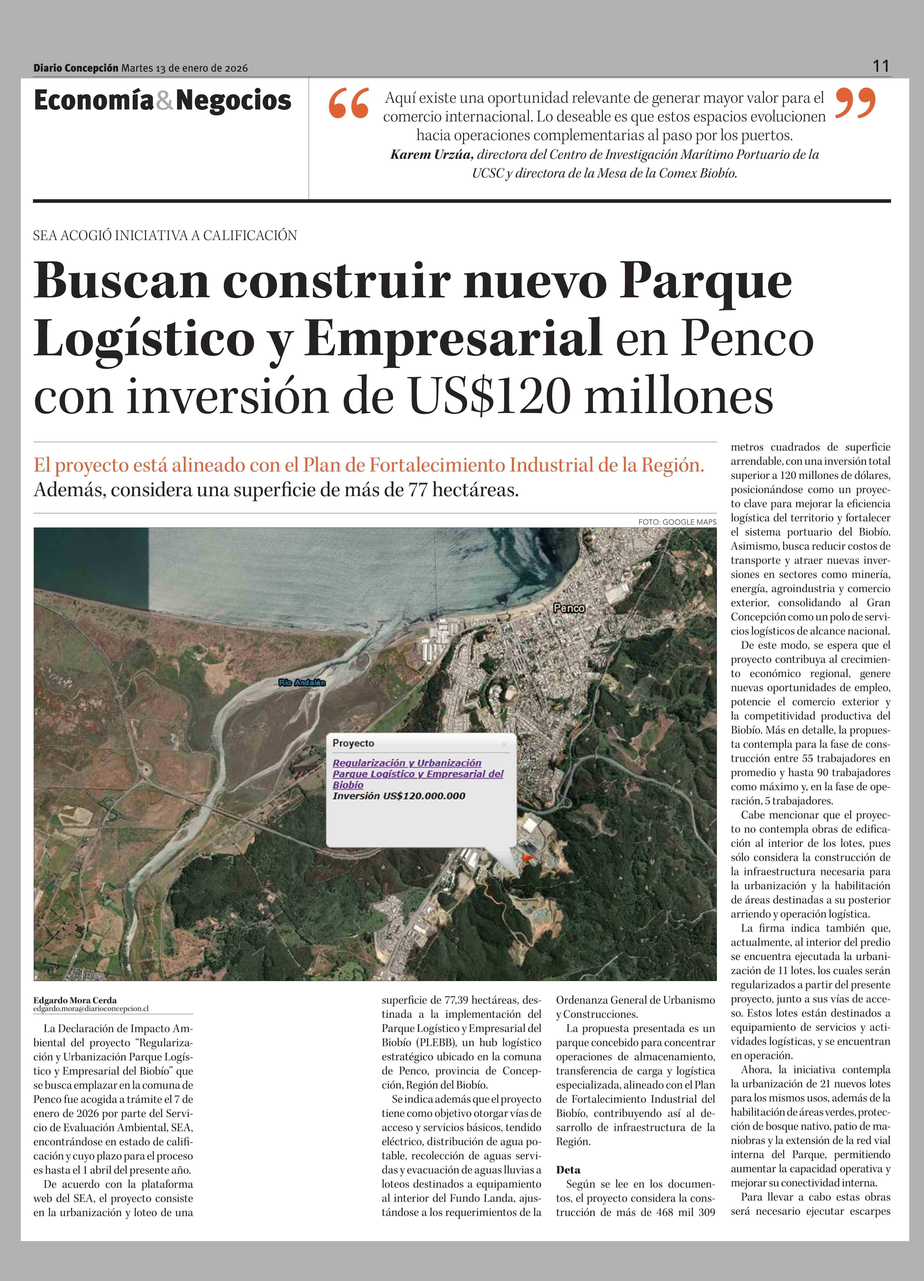 Buscan construir nuevo Parque Logístico y Empresarial en Penco con inversión de US$120 millones 13-01-2026 Diario Concepción |