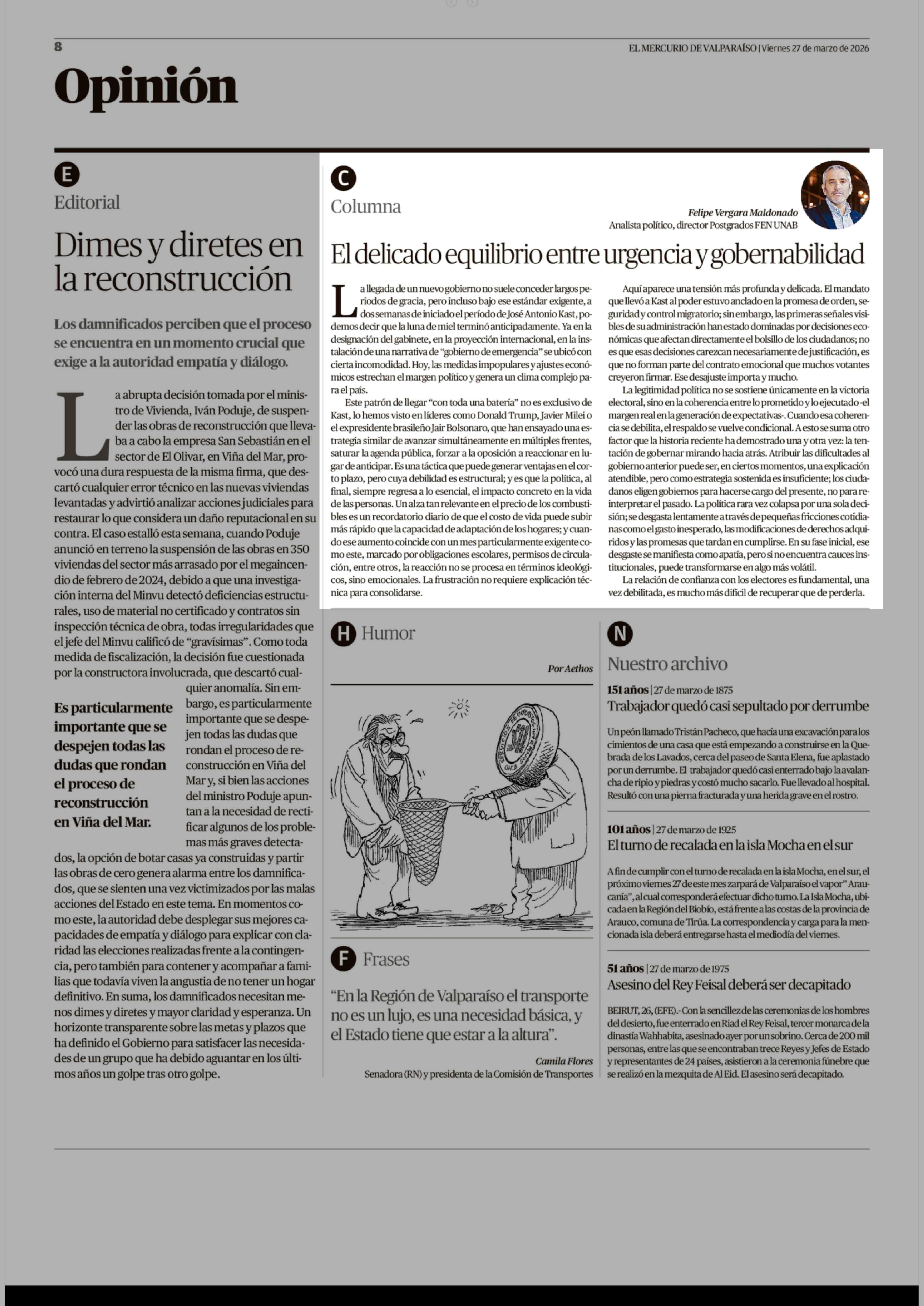 El delicado equilibrio entre urgencia y gobernabilidad 27-03-2026 El Mercurio de Valparaíso |