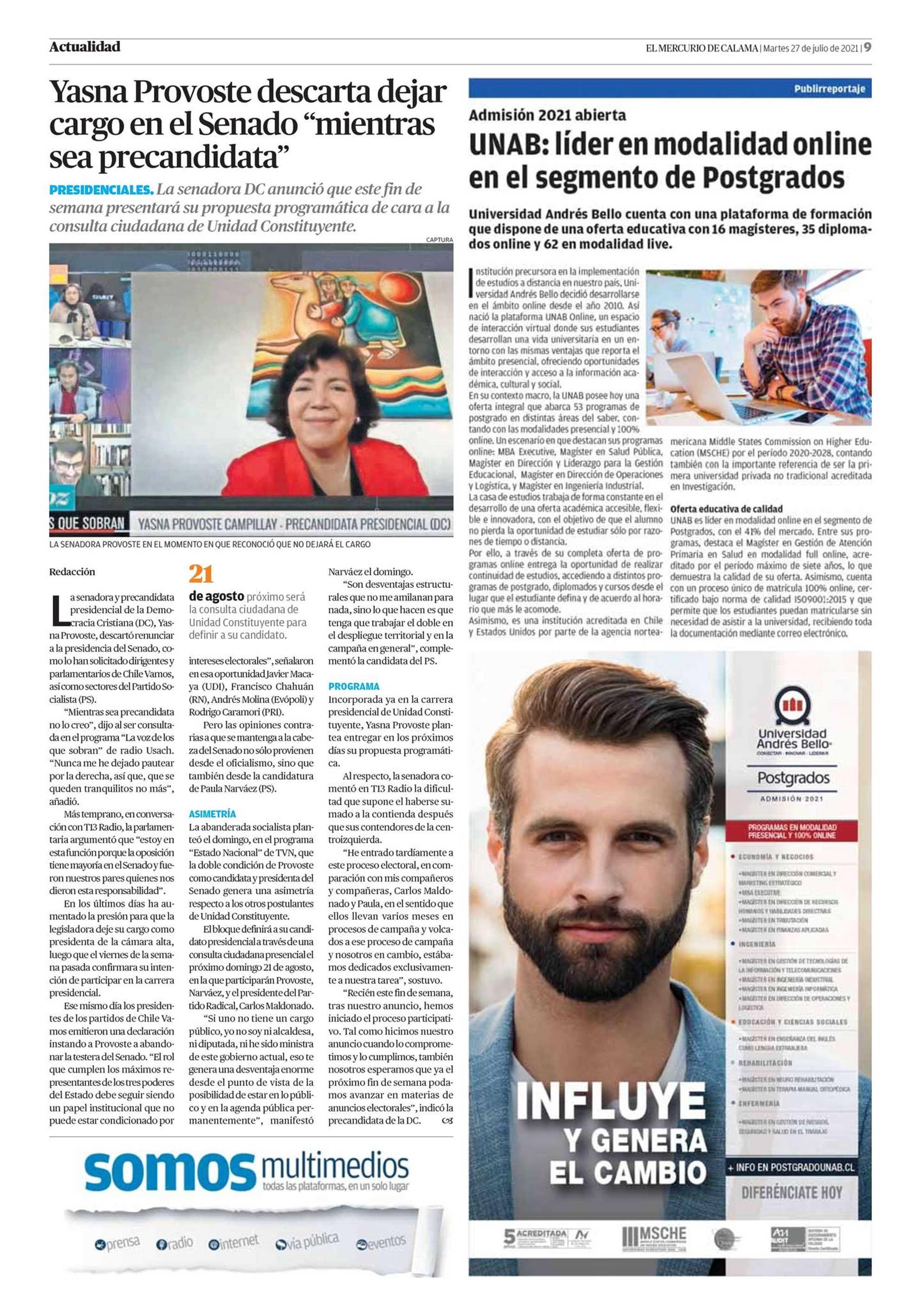 UNAB: líder en modalidad online en el segmento de Postgrados 27-07-2021 El Mercurio de Calama |