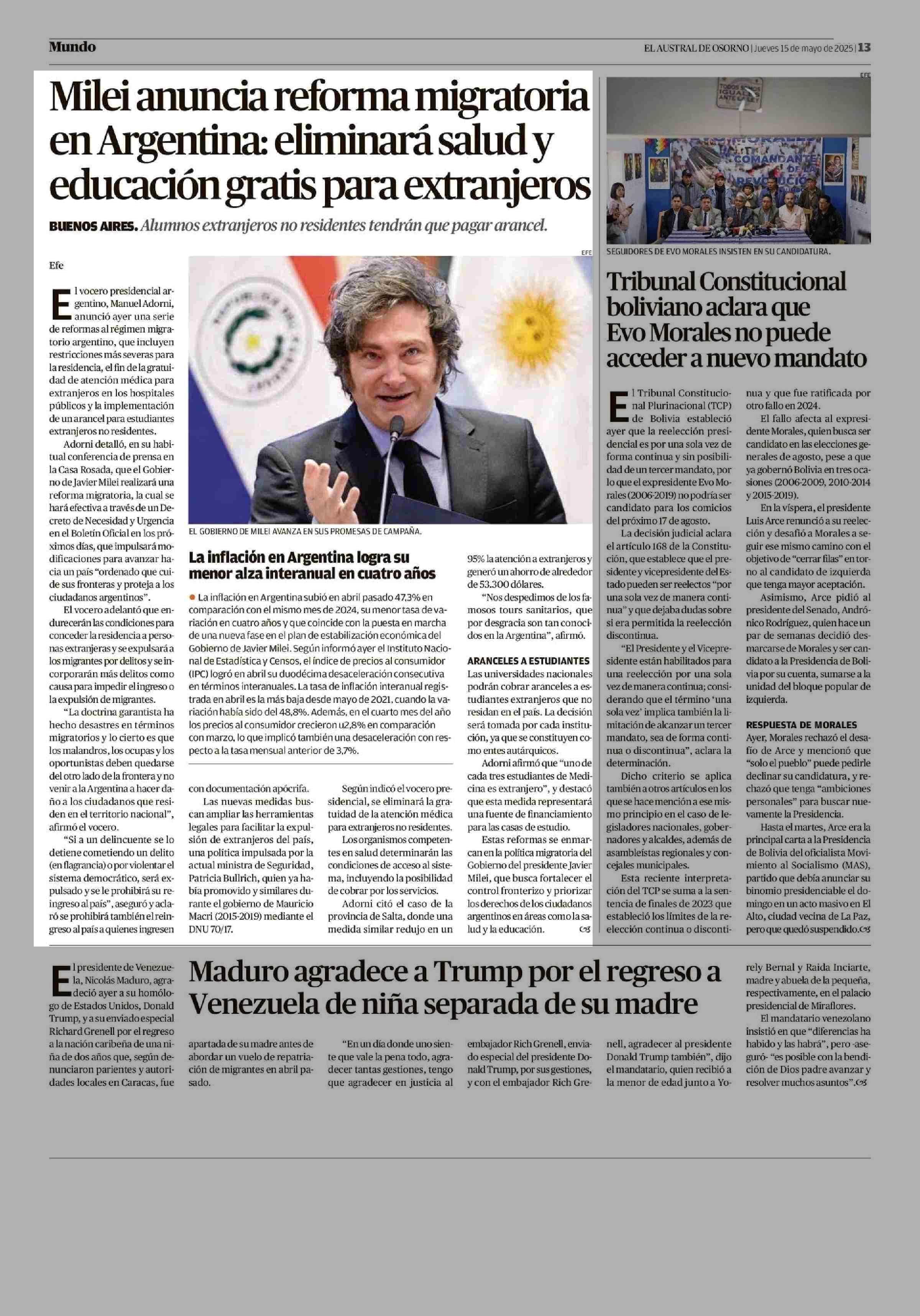 Milei anuncia reforma migratoria en Argentina: eliminará salud y educación gratis para extranjeros 15-05-2025 El Austral de Osorno |