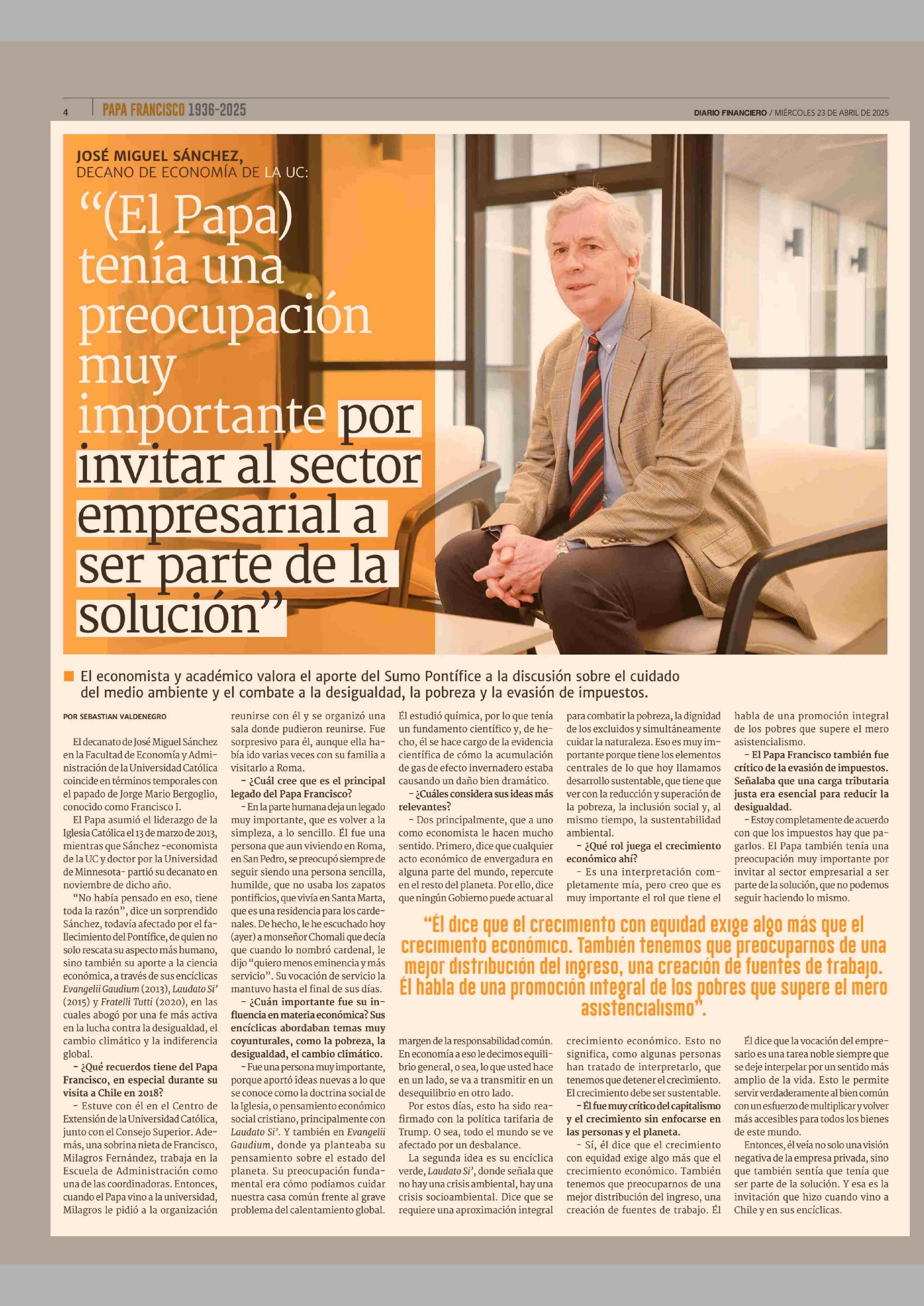 "(El Papa) tenía una preocupación muy importante por invitar al sector empresarial a ser parte de la solución" 23-04-2025 Diario Financiero |