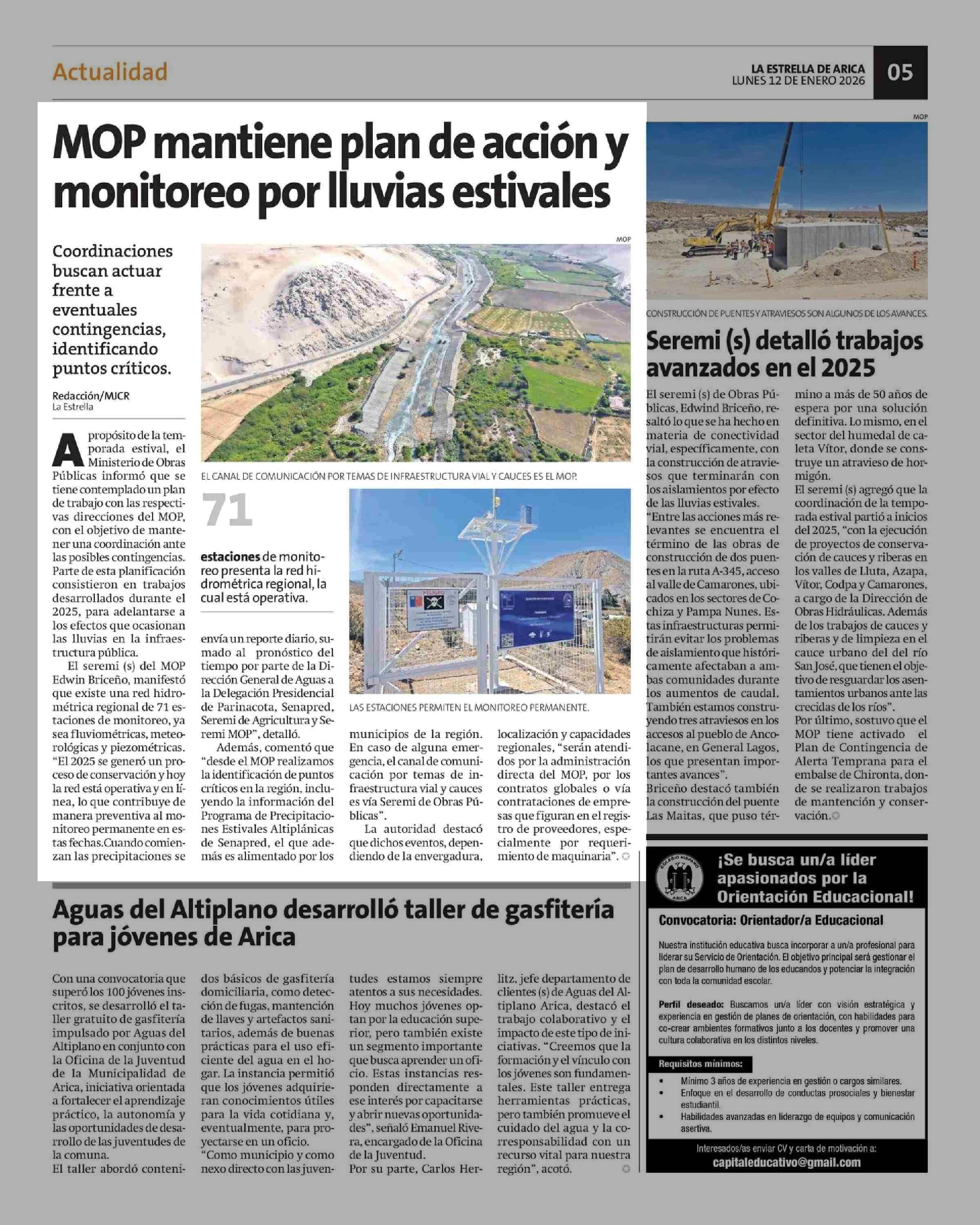 MOP mantiene plan de acción y monitoreo por lluvias estivales 12-01-2026 La Estrella de Arica |