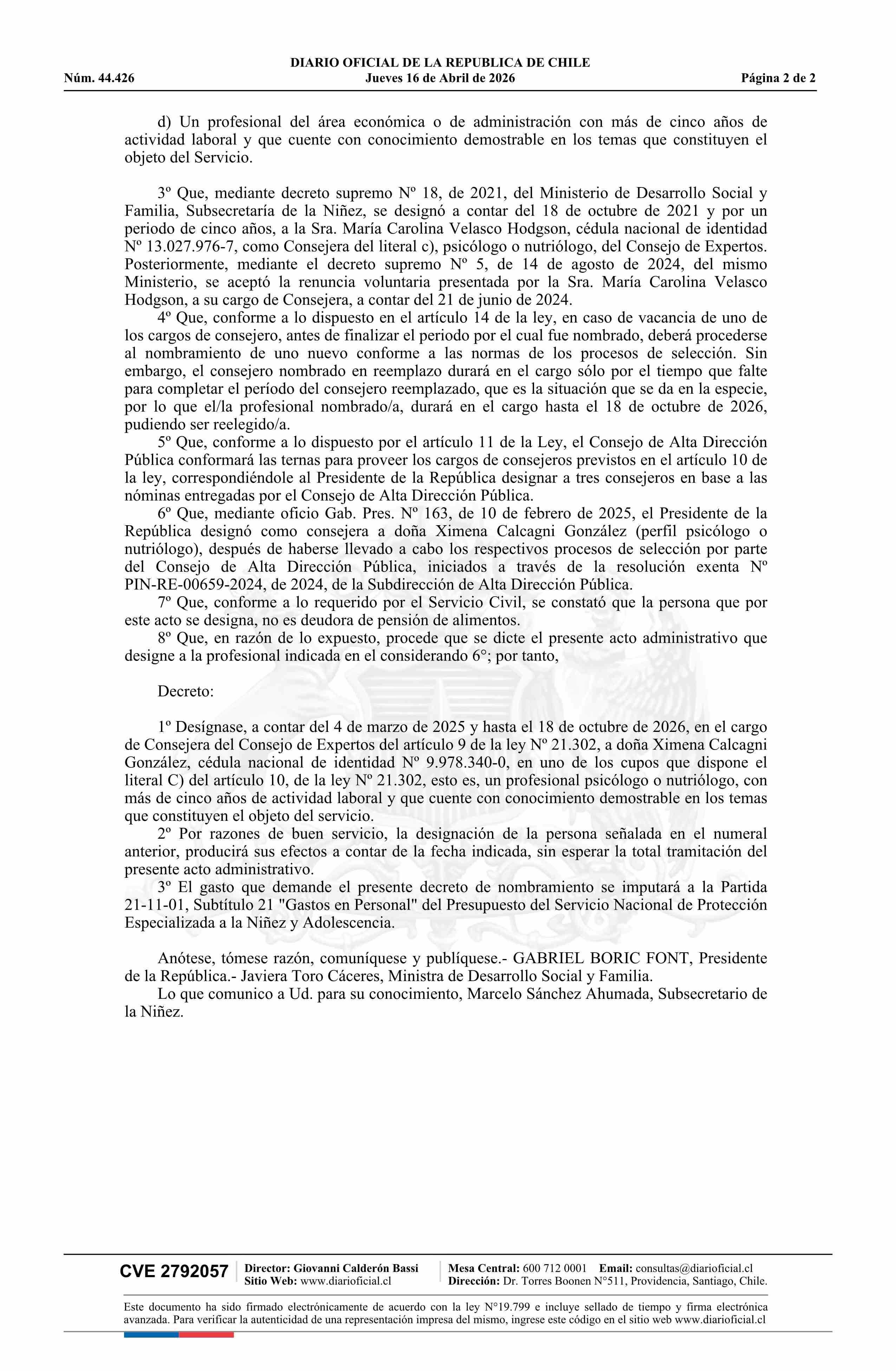Decreto número 2, de 2025.- Nombra consejero del literal C) del artículo 10 de la ley Nº 21.302 16-04-2026 Diario Oficial Edición Electrónica |