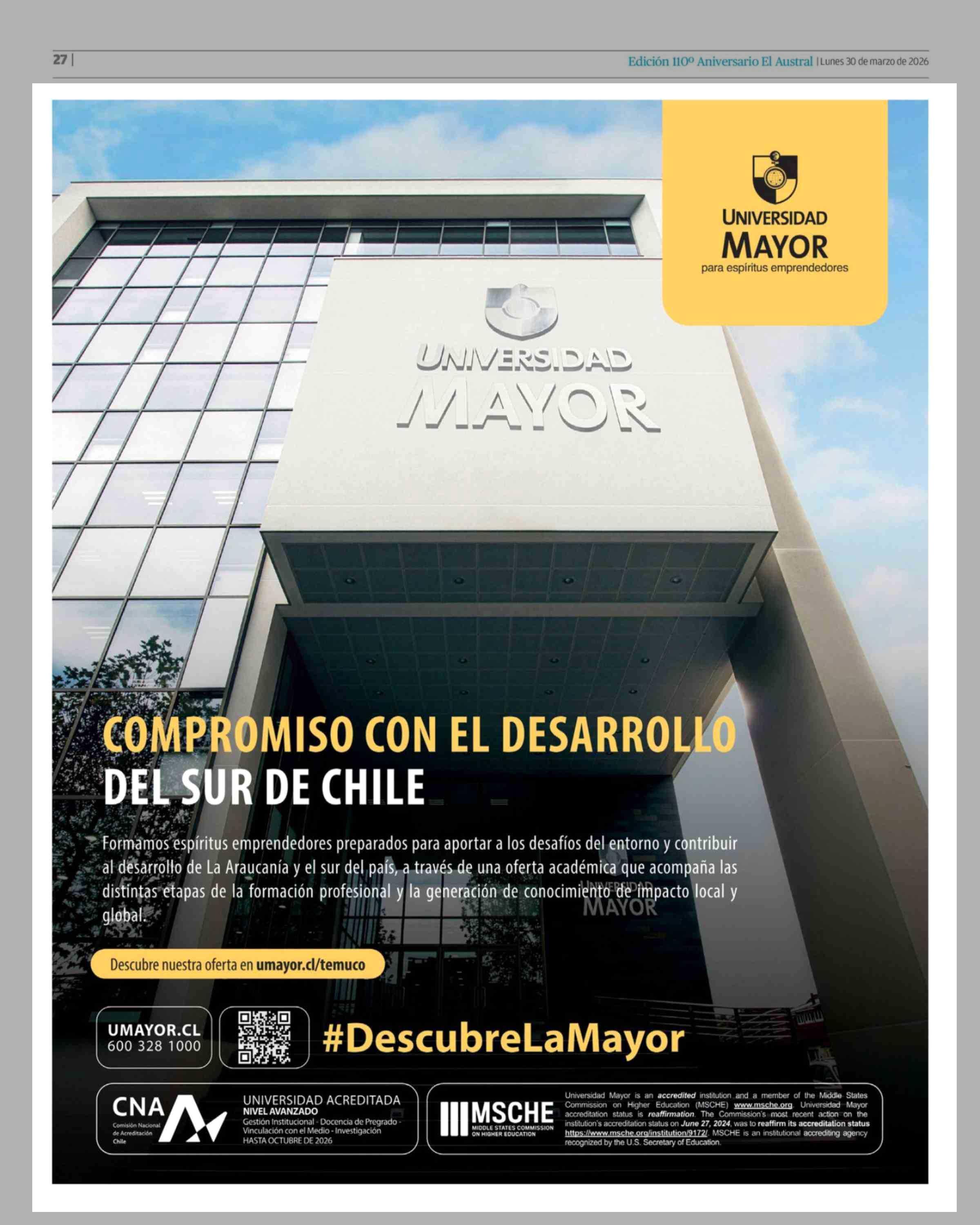 Aviso Universidad: Universidad Mayor 30-03-2026 El Austral de la Araucanía |