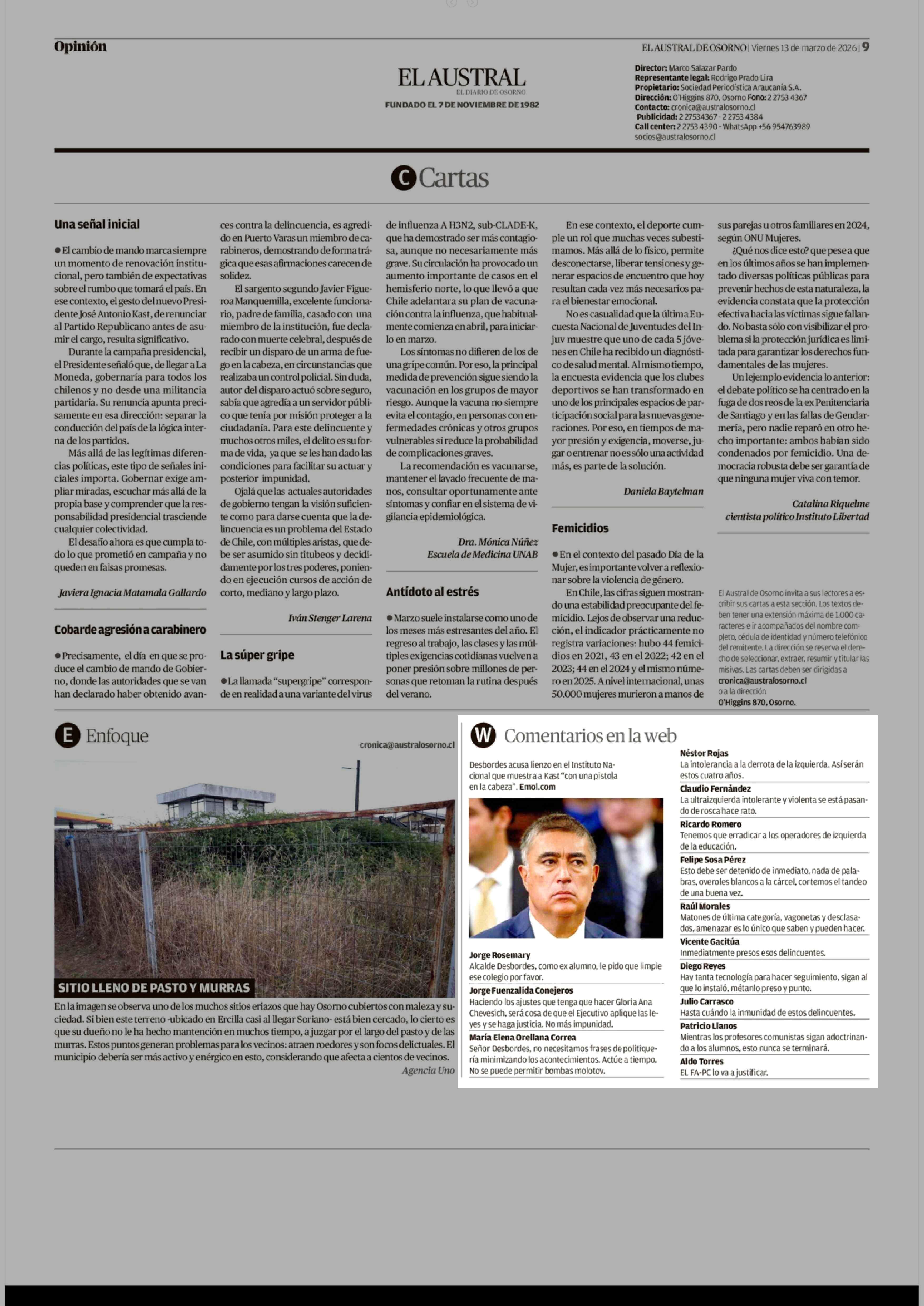 Comentarios en la web 13-03-2026 El Austral de Osorno |