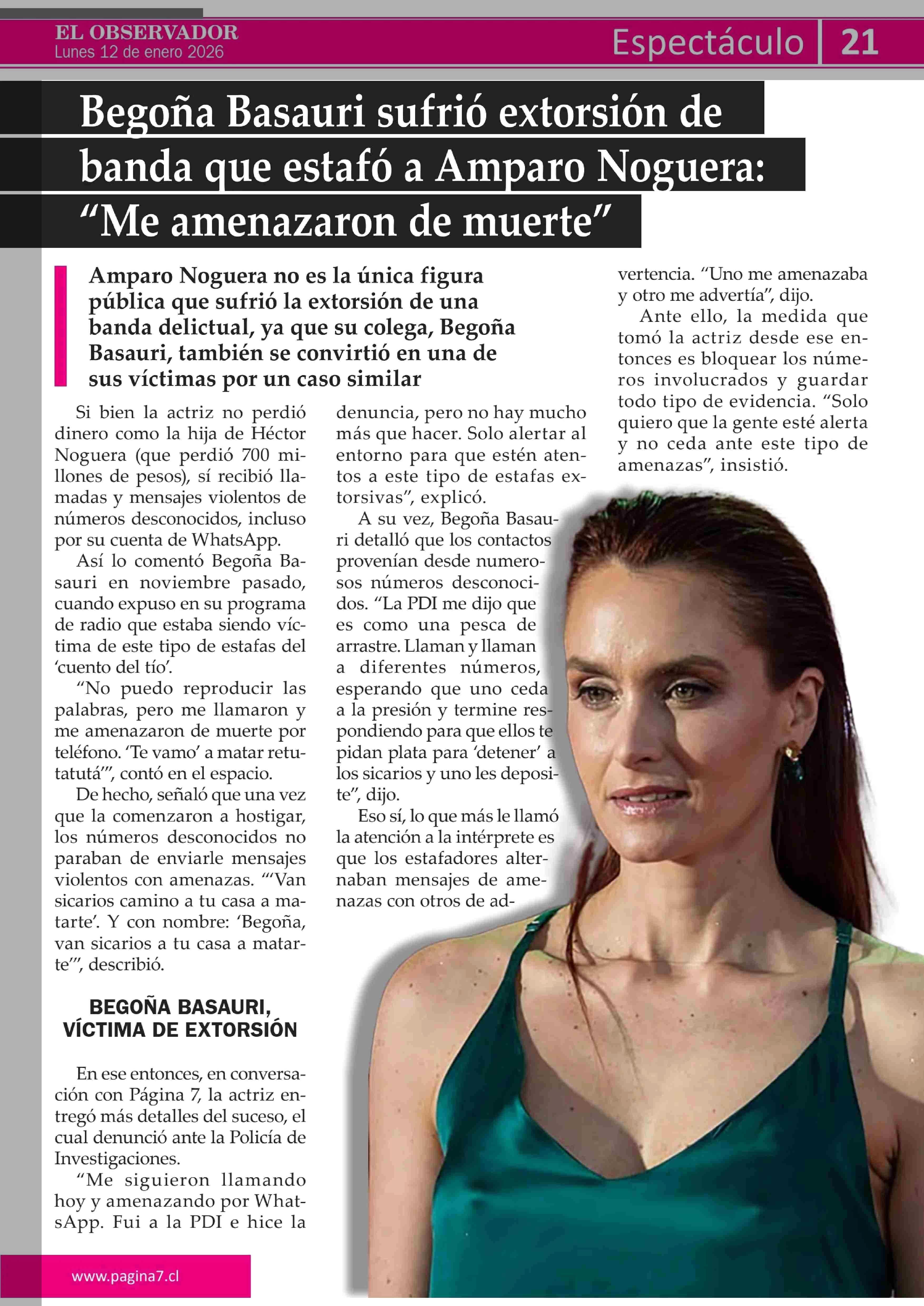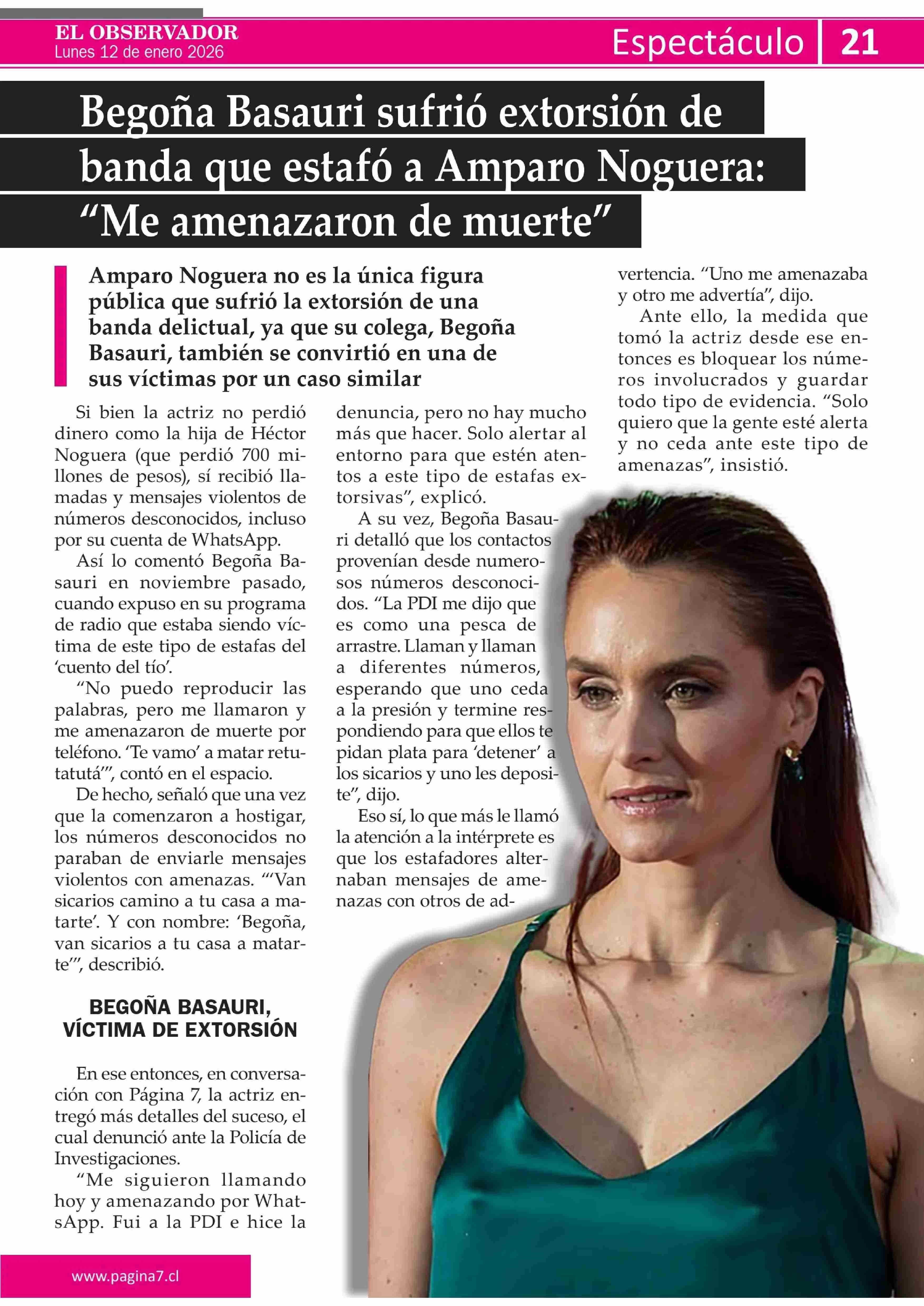 Begoña Basauri sufrió extorsión de banda que estafó a Amparo Noguera: "Me amenazaron de muerte" 12-01-2026 El Observador Vespertino |