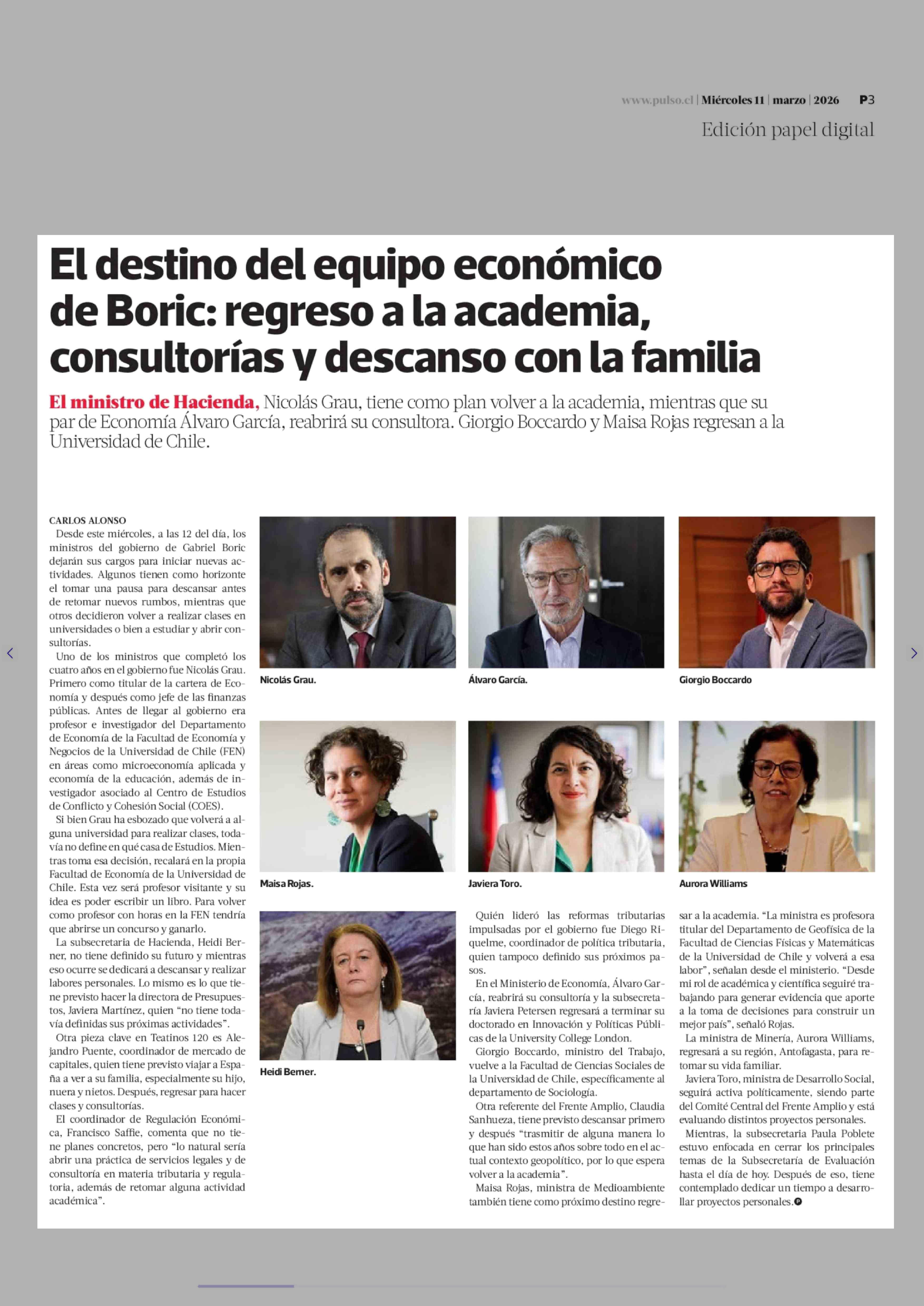 El destino del equipo económico de Boric: regreso a la academia, consultorías y descanso con la familia 11-03-2026 La Tercera |