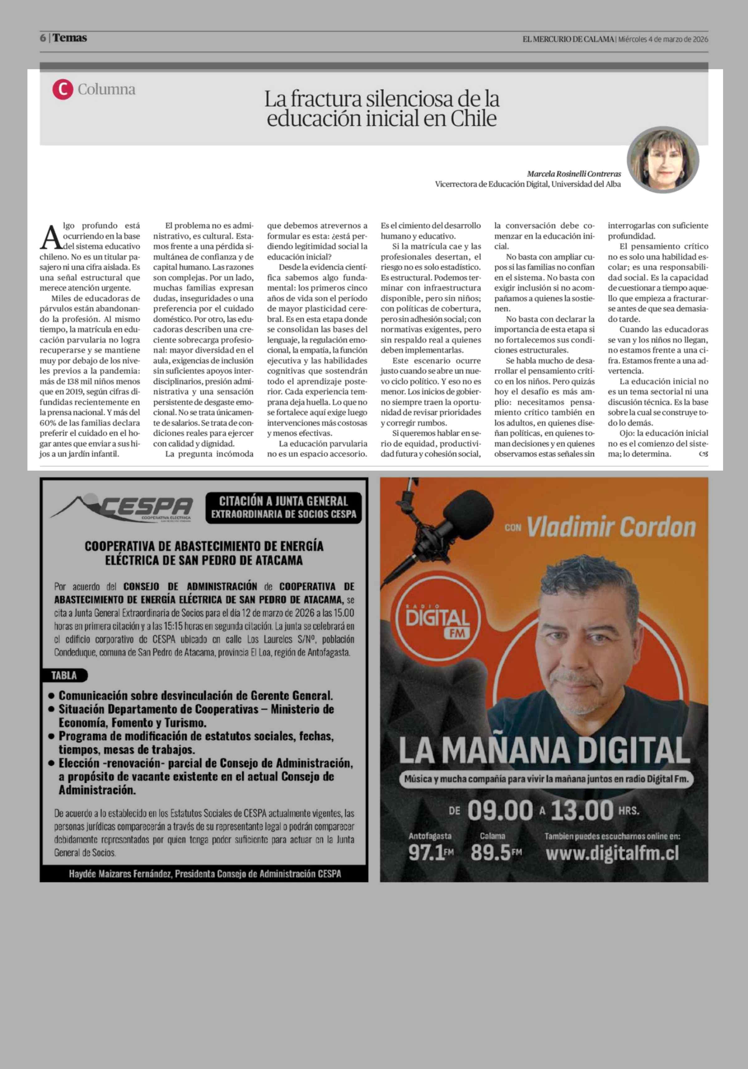 Columnas de Opinión: La fractura silenciosa de la educación inicial en Chile 04-03-2026 El Mercurio de Calama |