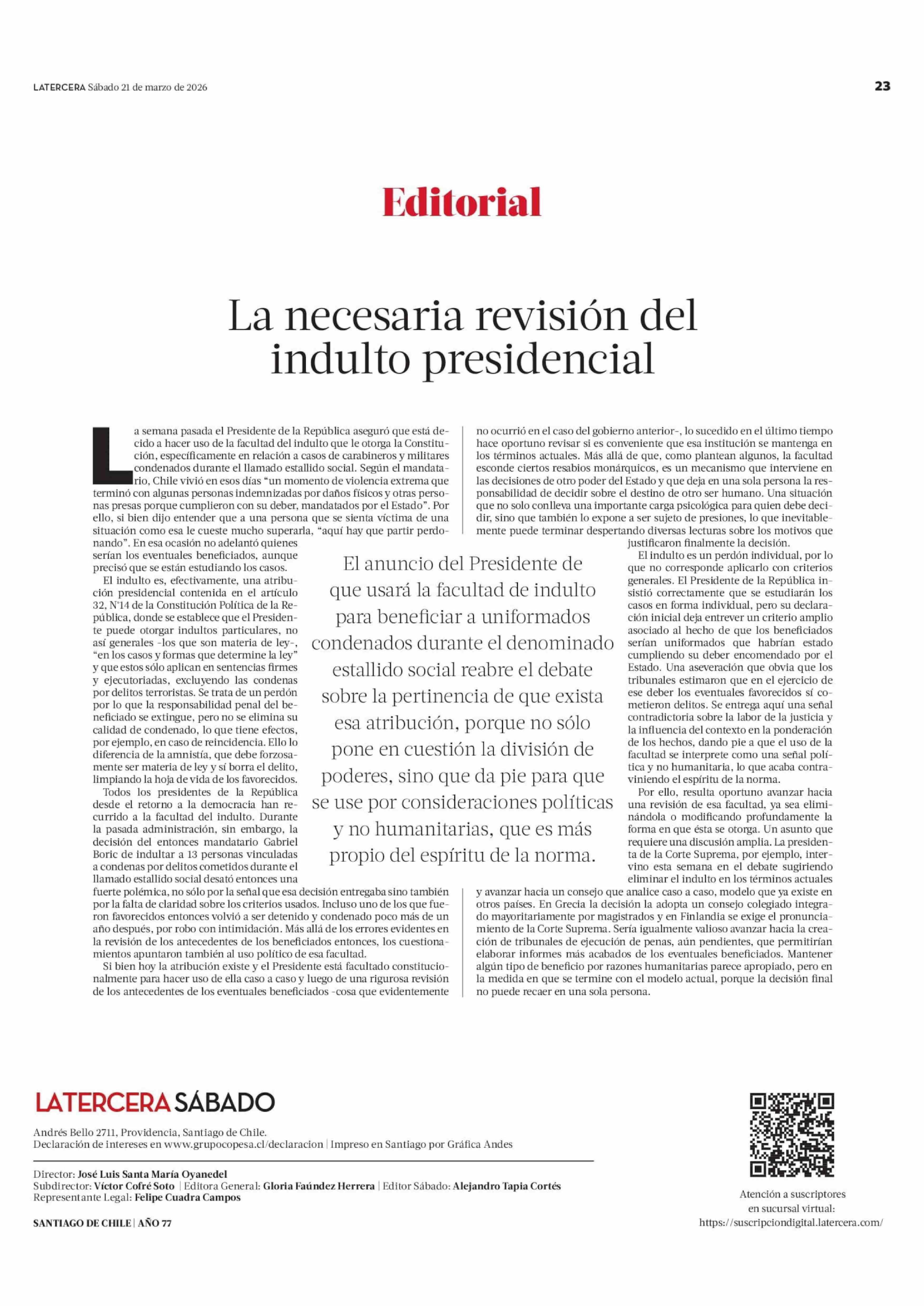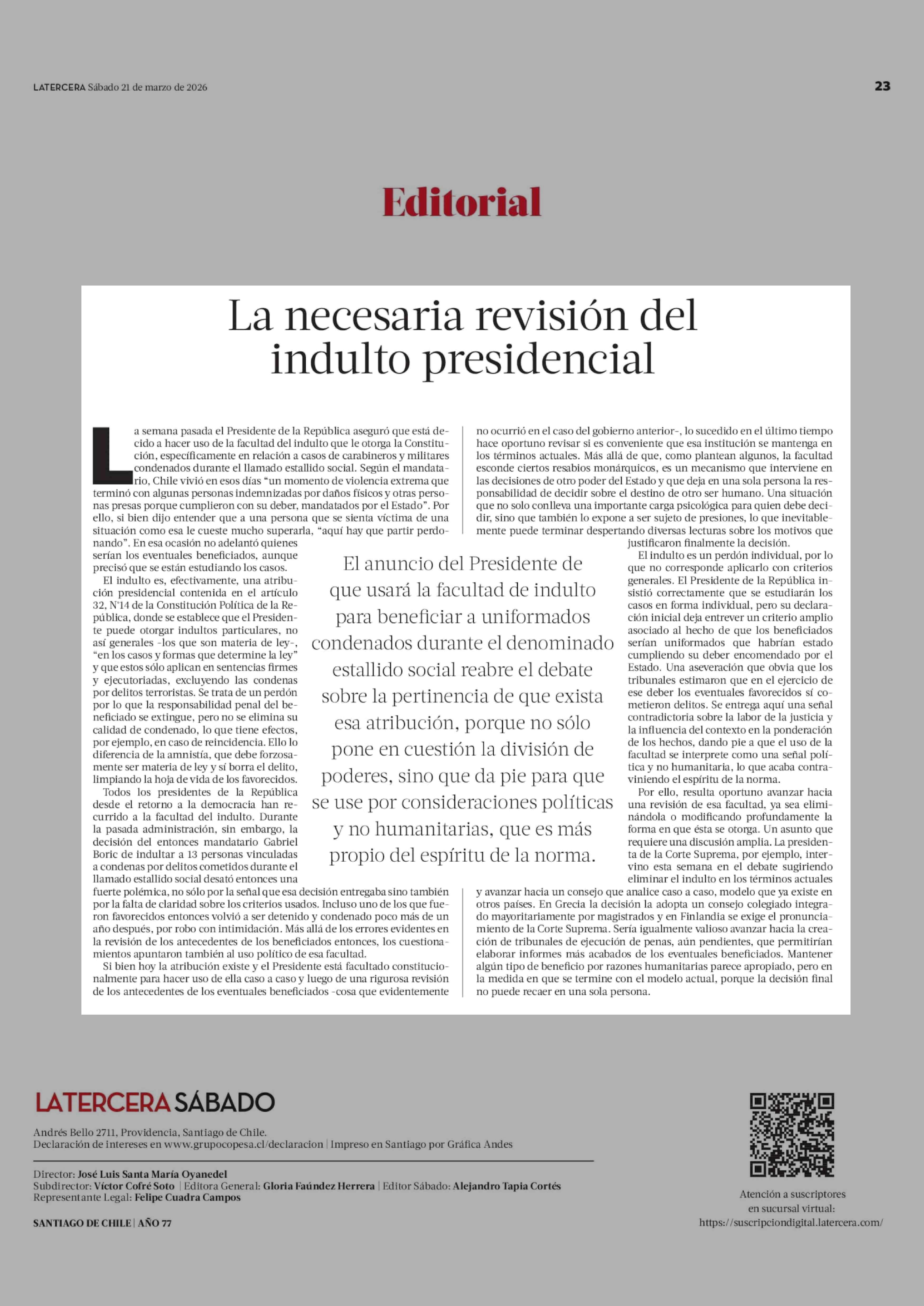 Editorial: La necesaria revisión del indulto presidencial 21-03-2026 La Tercera |