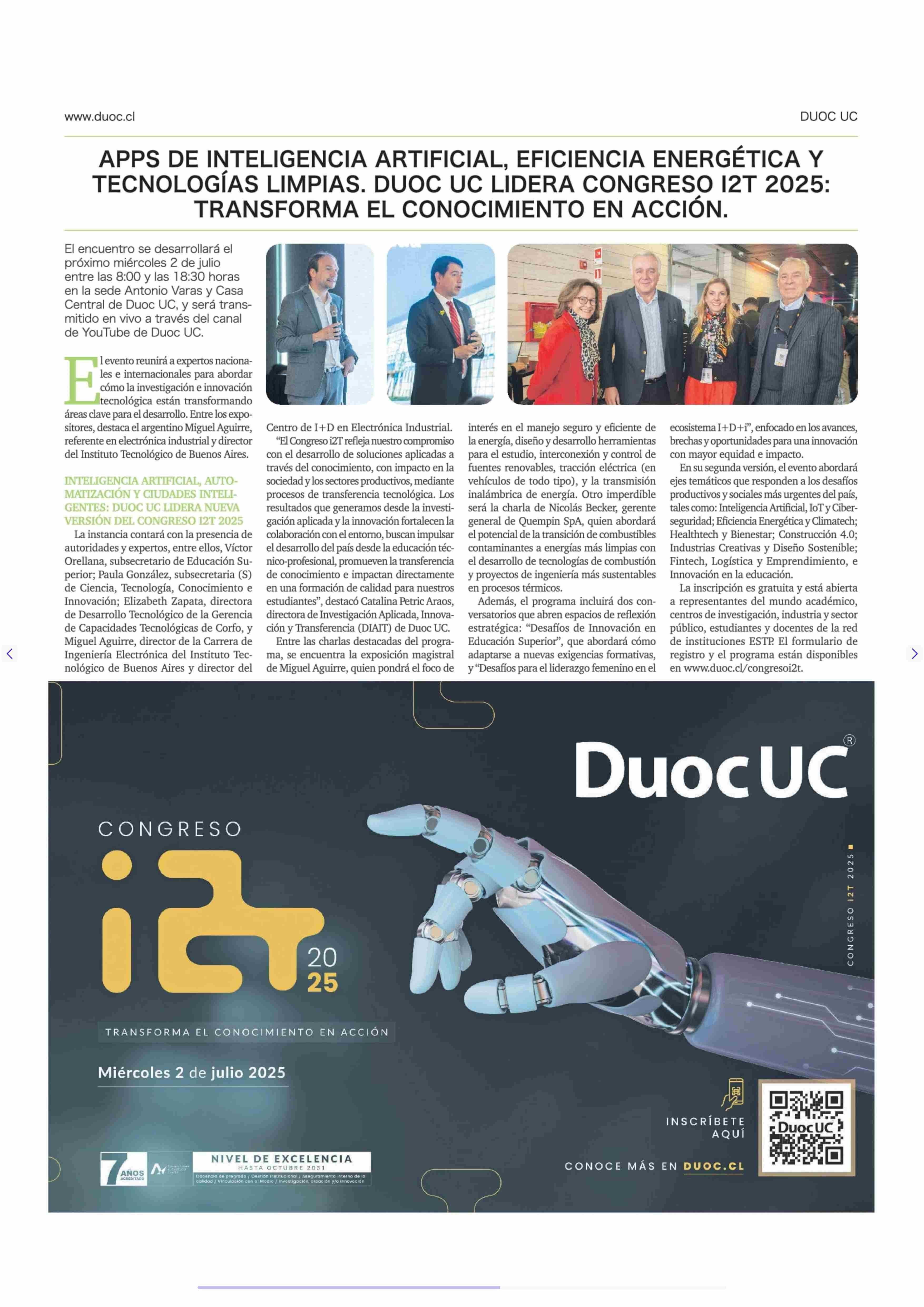 Título: APPS DE INTELIGENCIA ARTIFICIAL, EFICIENCIA ENERGÉTICA Y TECNOLOGÍAS LIMPIAS. DUOC UC LIDERA CONGRESO I2T 2025: TRANSFORMA EL CONOCIMIENTO EN ACCIÓN.