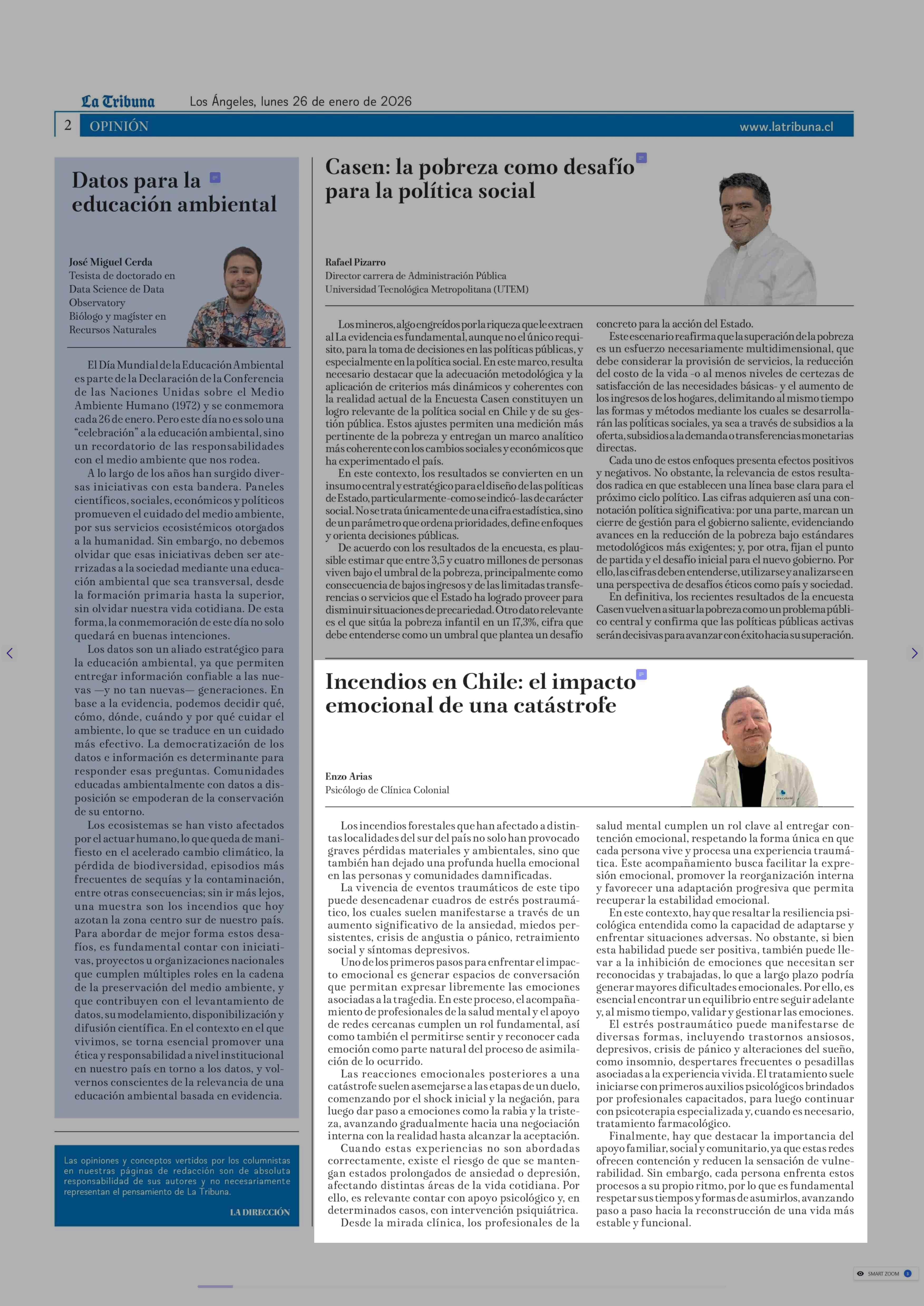 Columnas de Opinión: Incendios en Chile: el impacto emocional de una catástrofe 26-01-2026 La Tribuna |