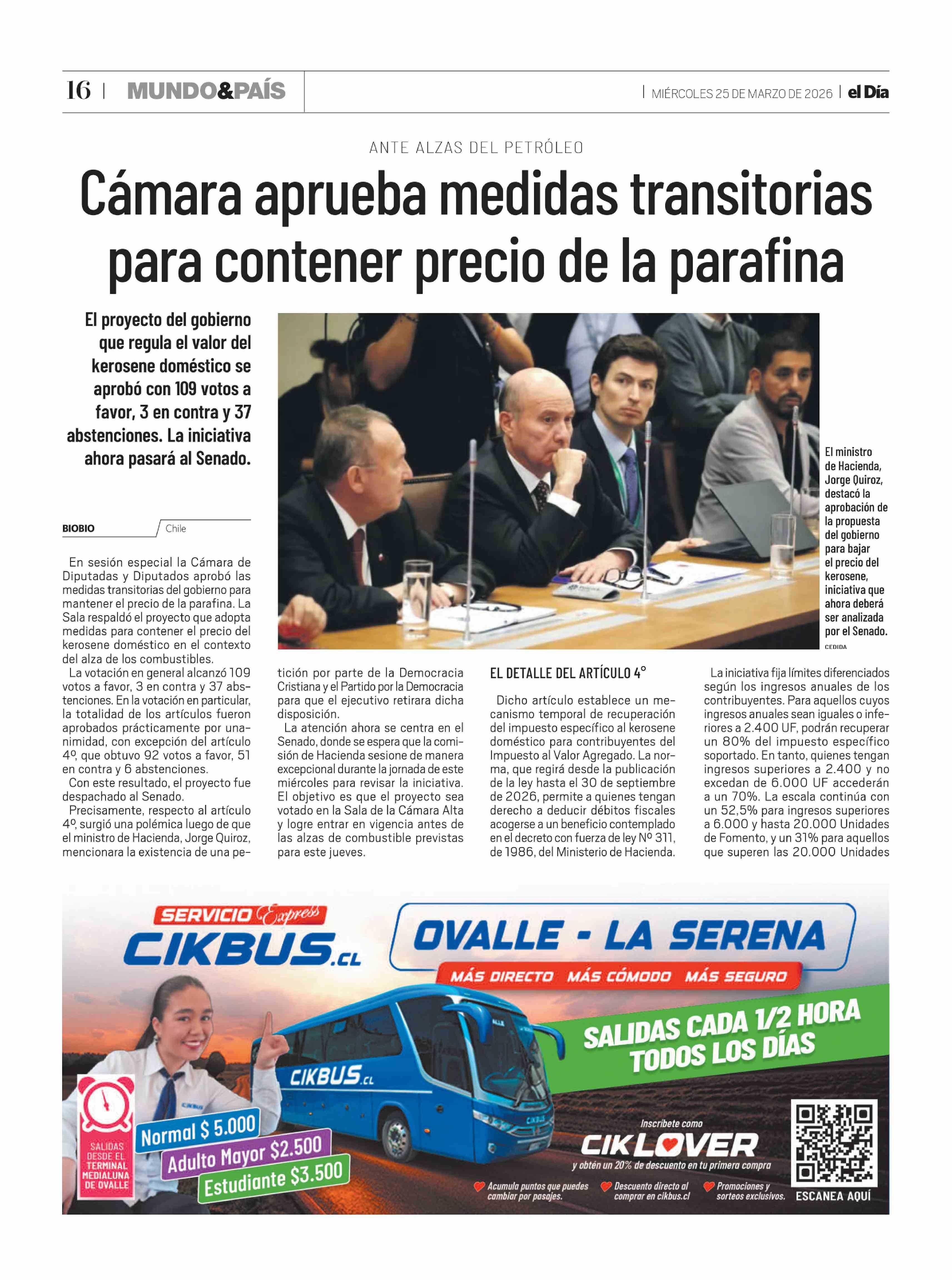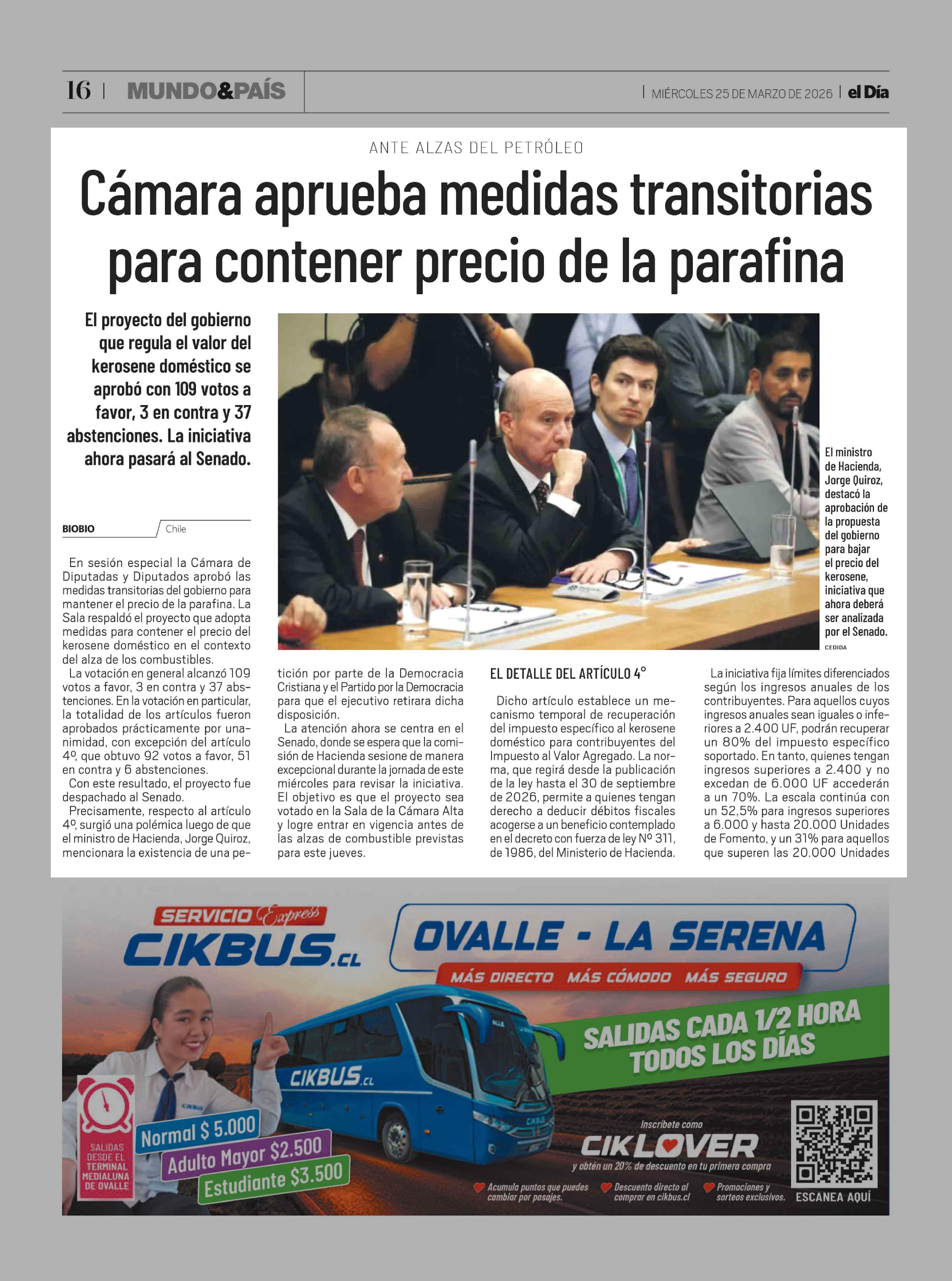 Cámara aprueba medidas transitorias para contener precio de la parafina 25-03-2026 El Día |