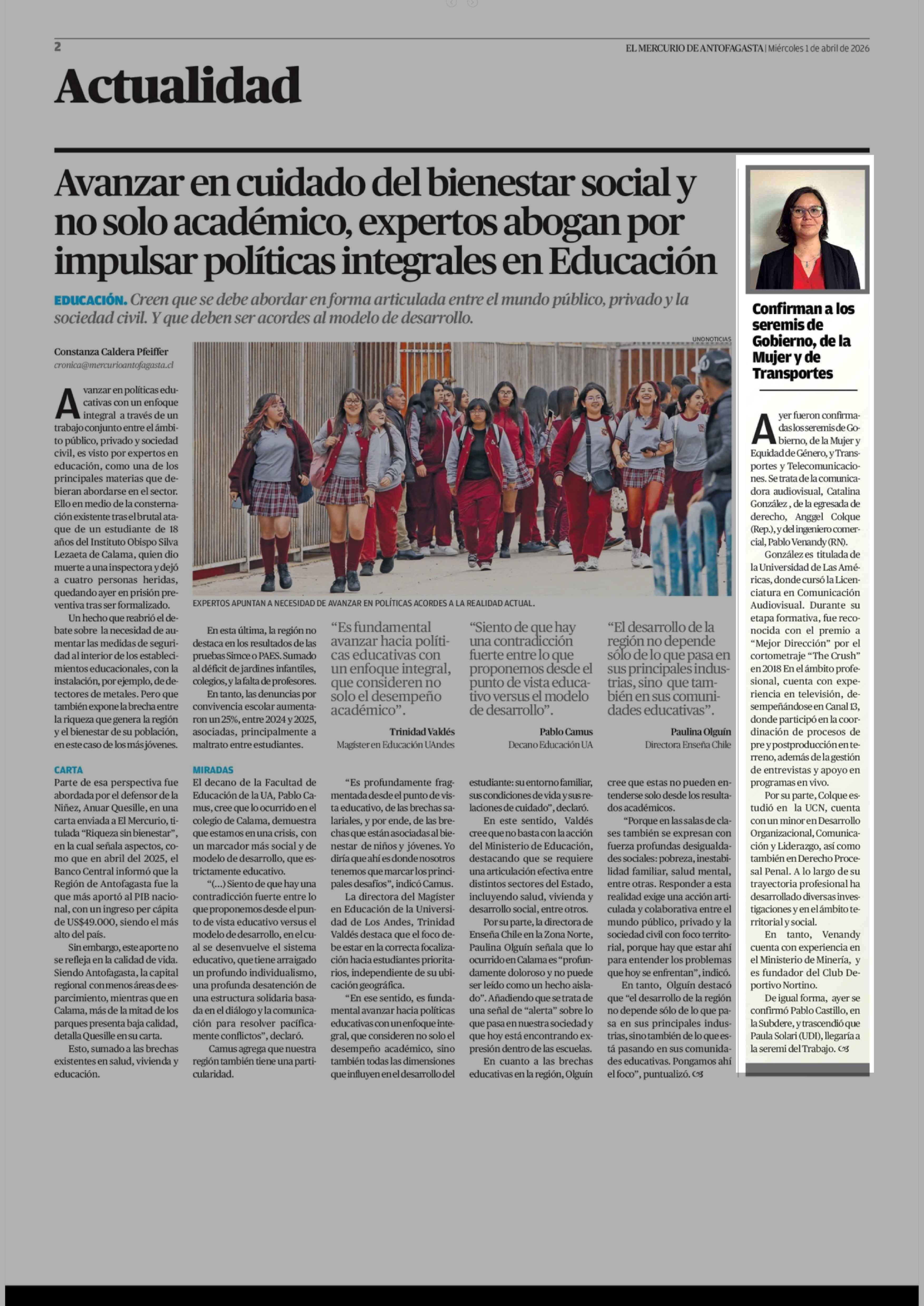 Confirman a los seremis de Gobierno, de la Mujer y de Transportes 01-04-2026 El Mercurio de Antofagasta |