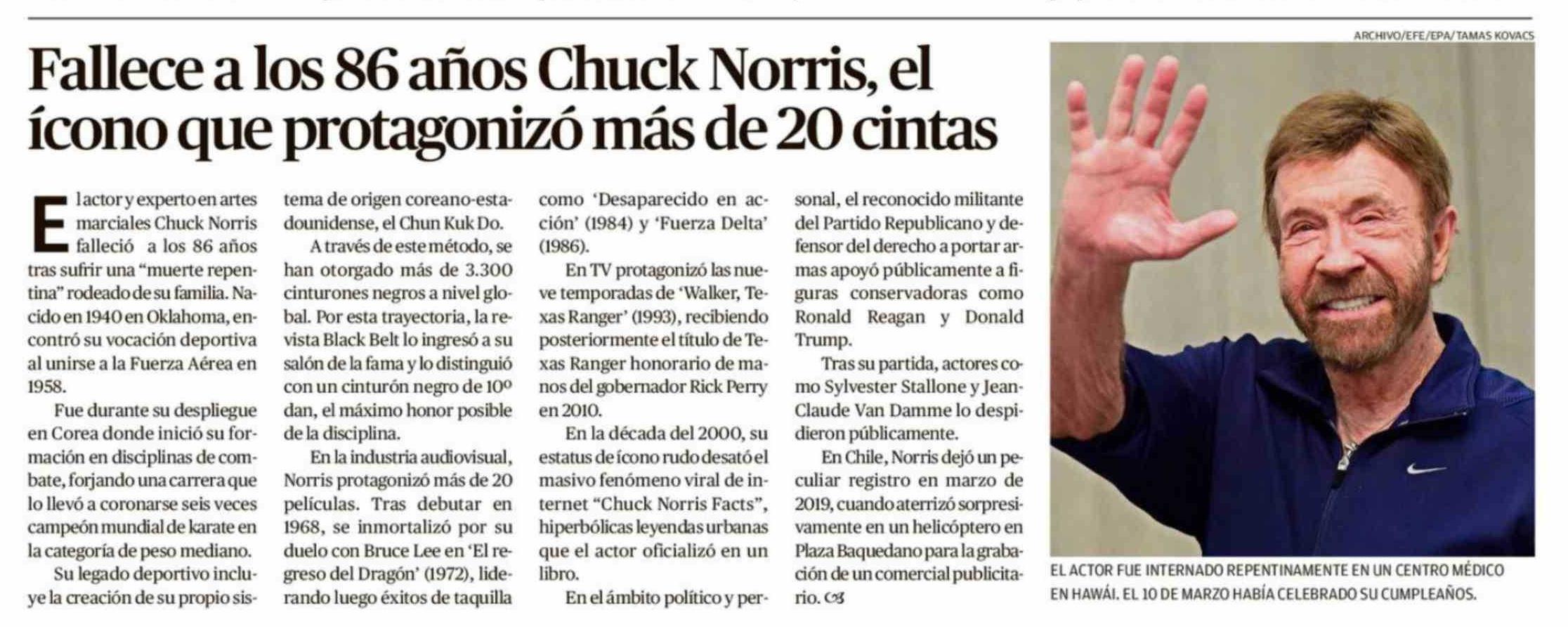 | Título: | Fallece a los 86 años Chuck Norris, el ícono que protagonizó más de 20 cintas |