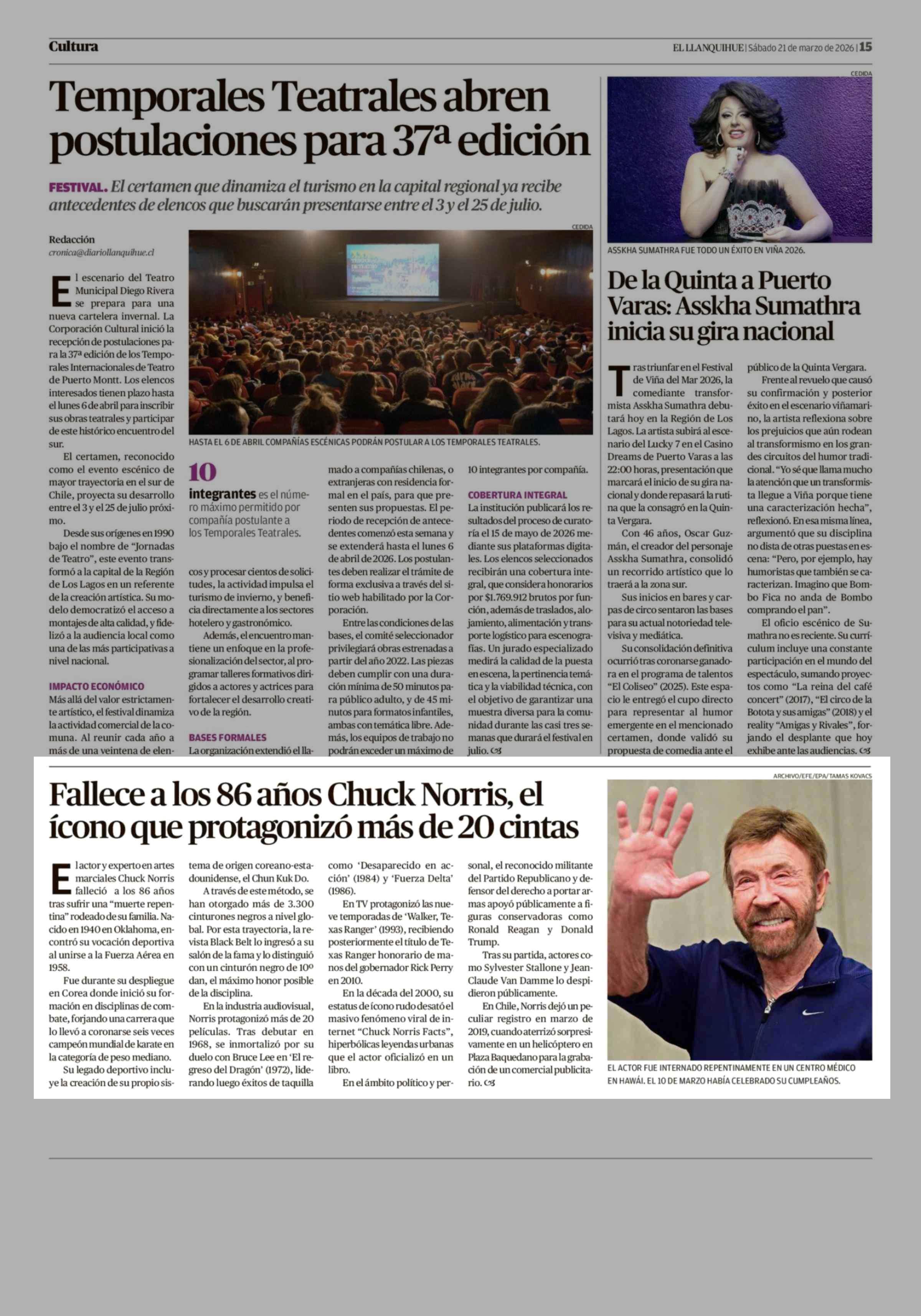Fallece a los 86 años Chuck Norris, el ícono que protagonizó más de 20 cintas 21-03-2026 El Llanquihue |