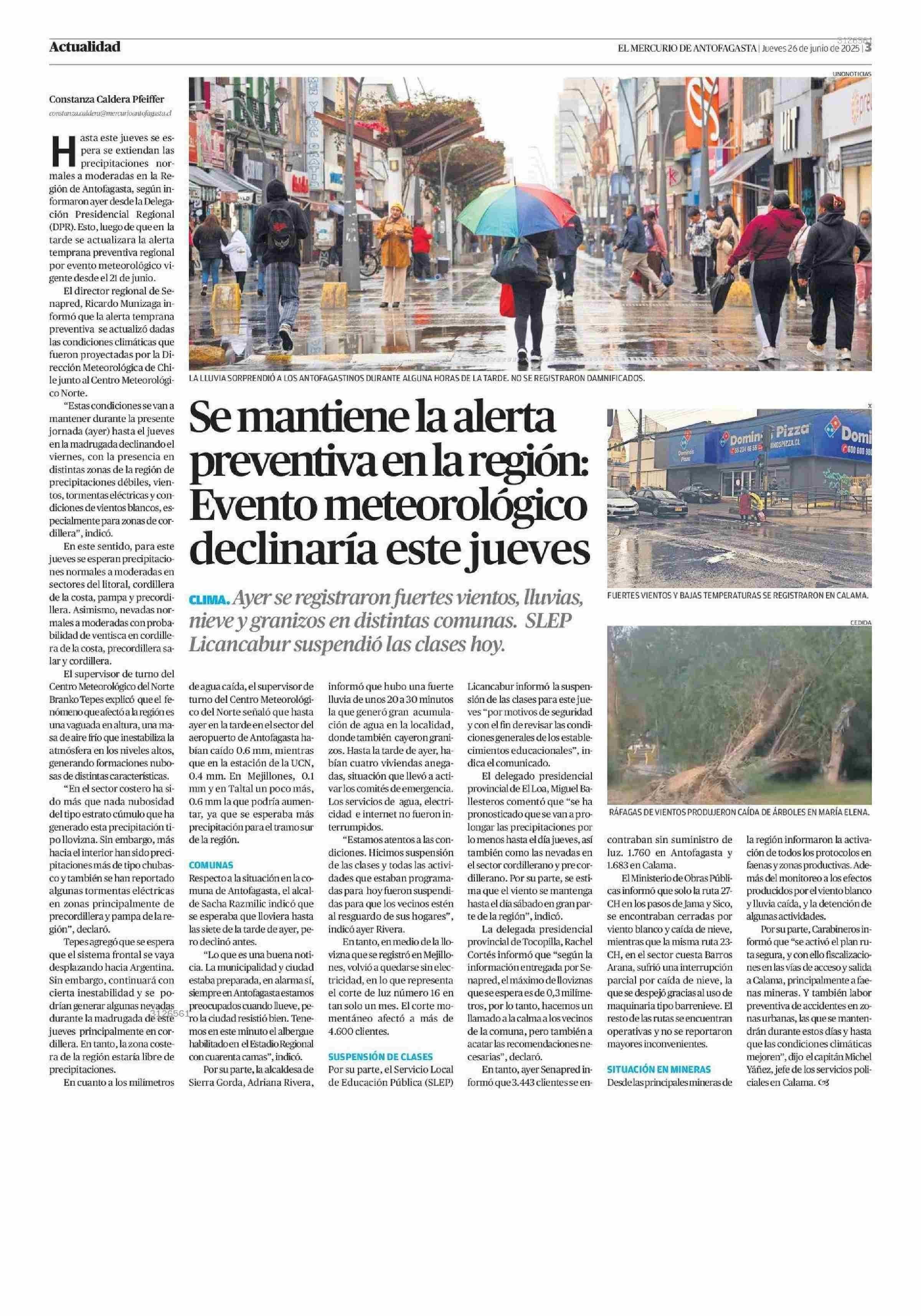 Se mantiene la alerta preventiva en la región: Evento meteorológico declinaría este jueves 26-06-2025 El Mercurio de Antofagasta |