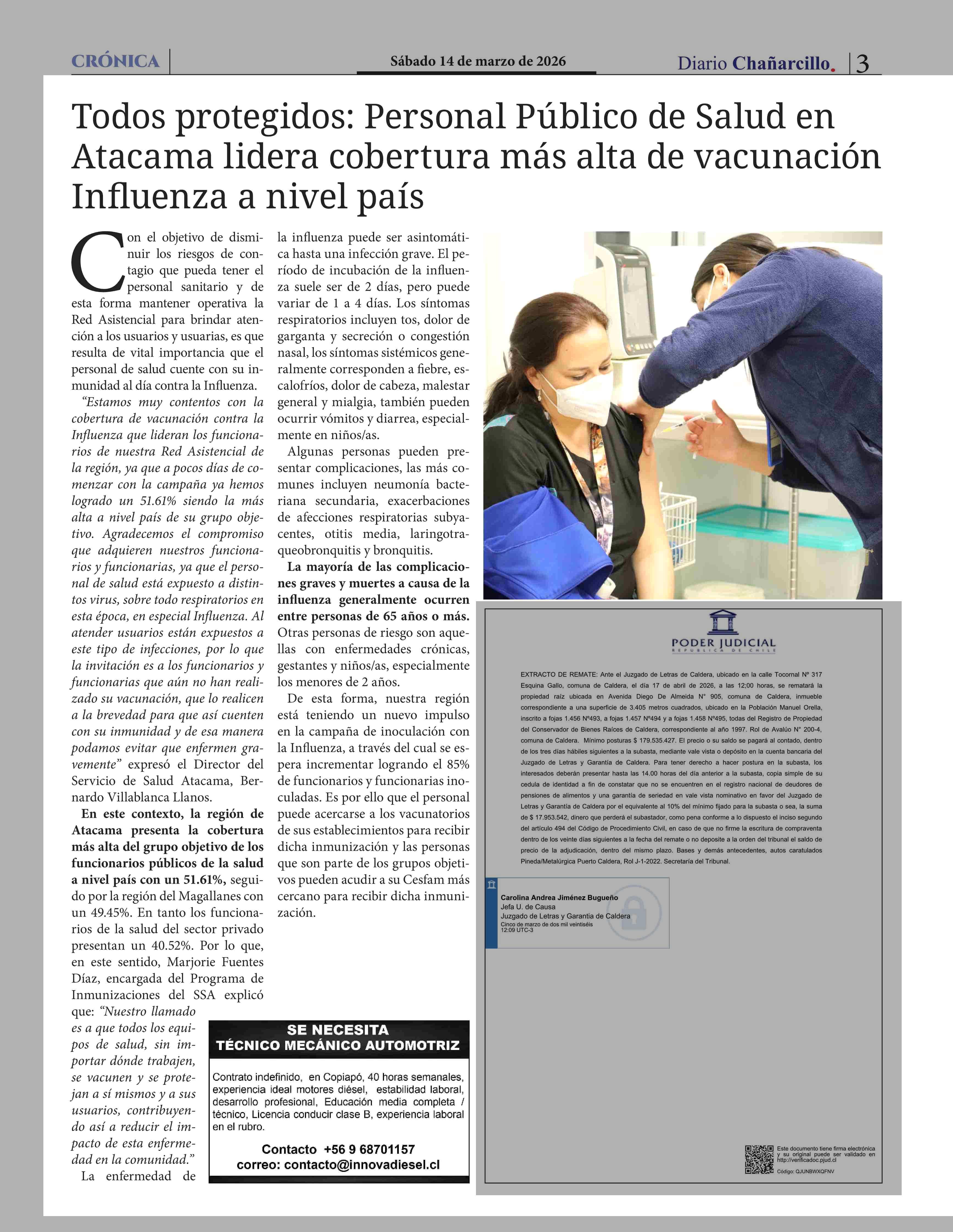 Todos protegidos: Personal Público de Salud en Atacama lidera cobertura más alta de vacunación Influenza a nivel país 14-03-2026 Diario Chañarcillo |