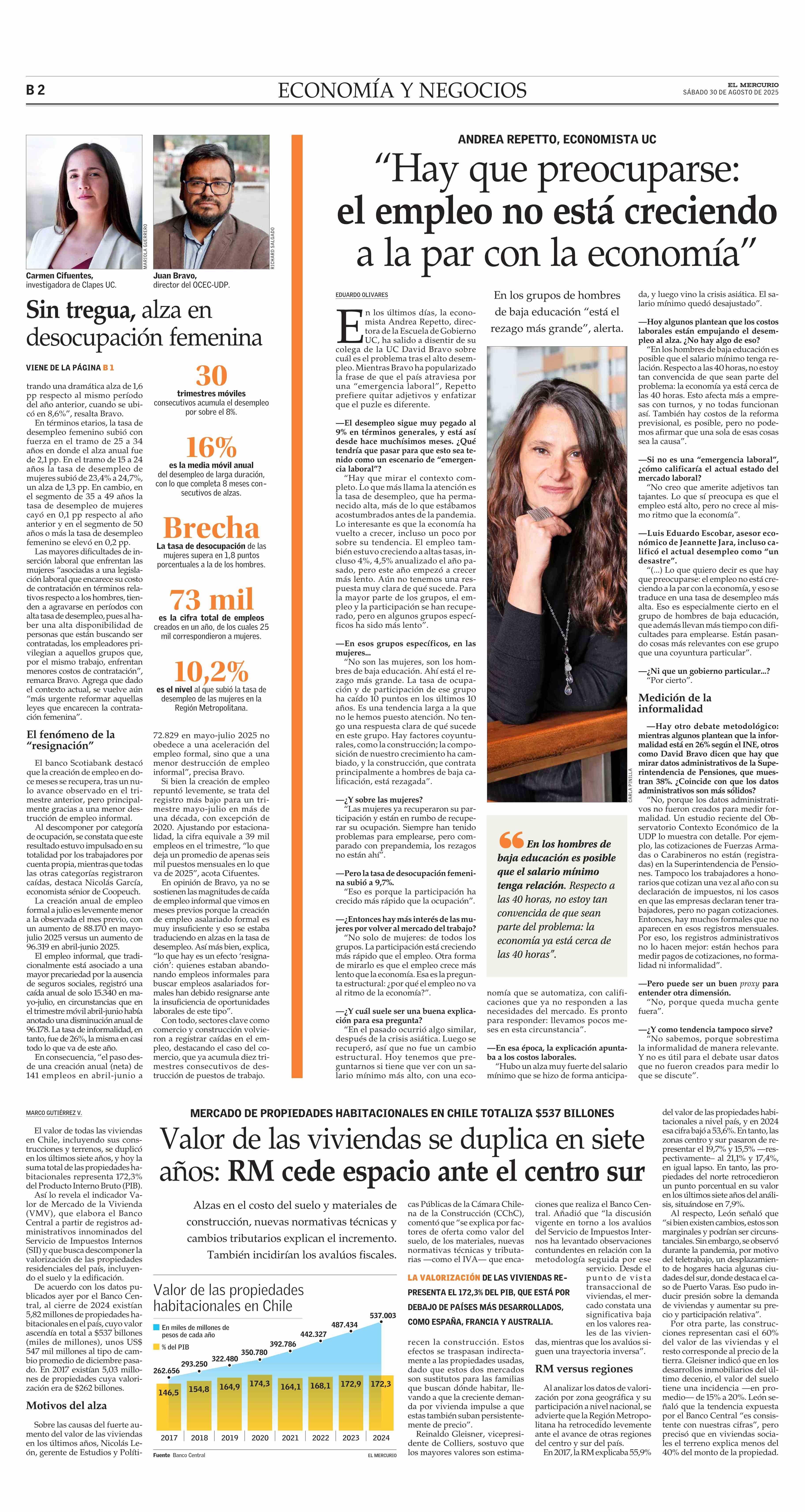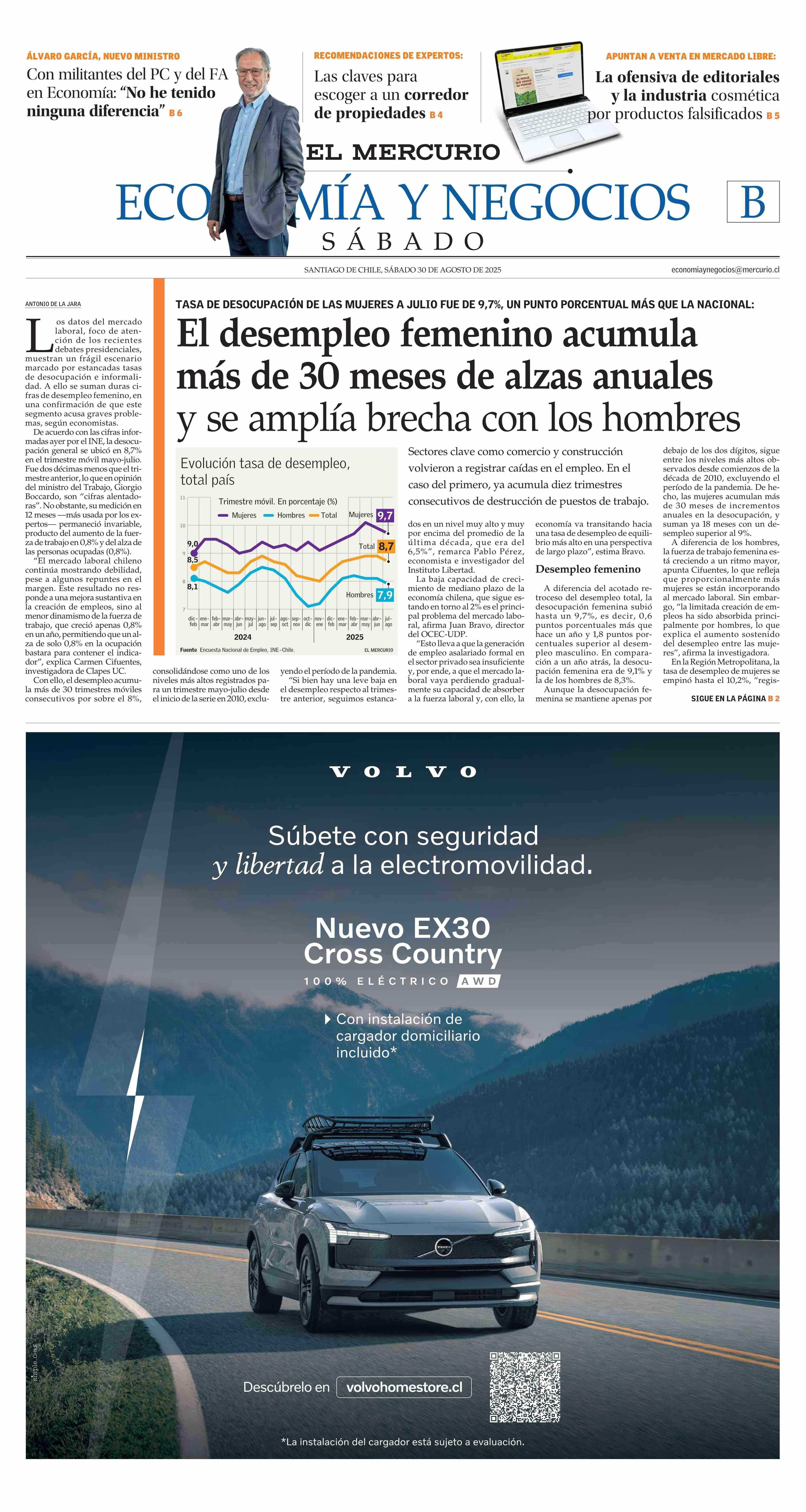 El desempleo femenino acumula más de 30 meses de alzas anuales y se amplía brecha con los hombres 30-08-2025 El Mercurio |