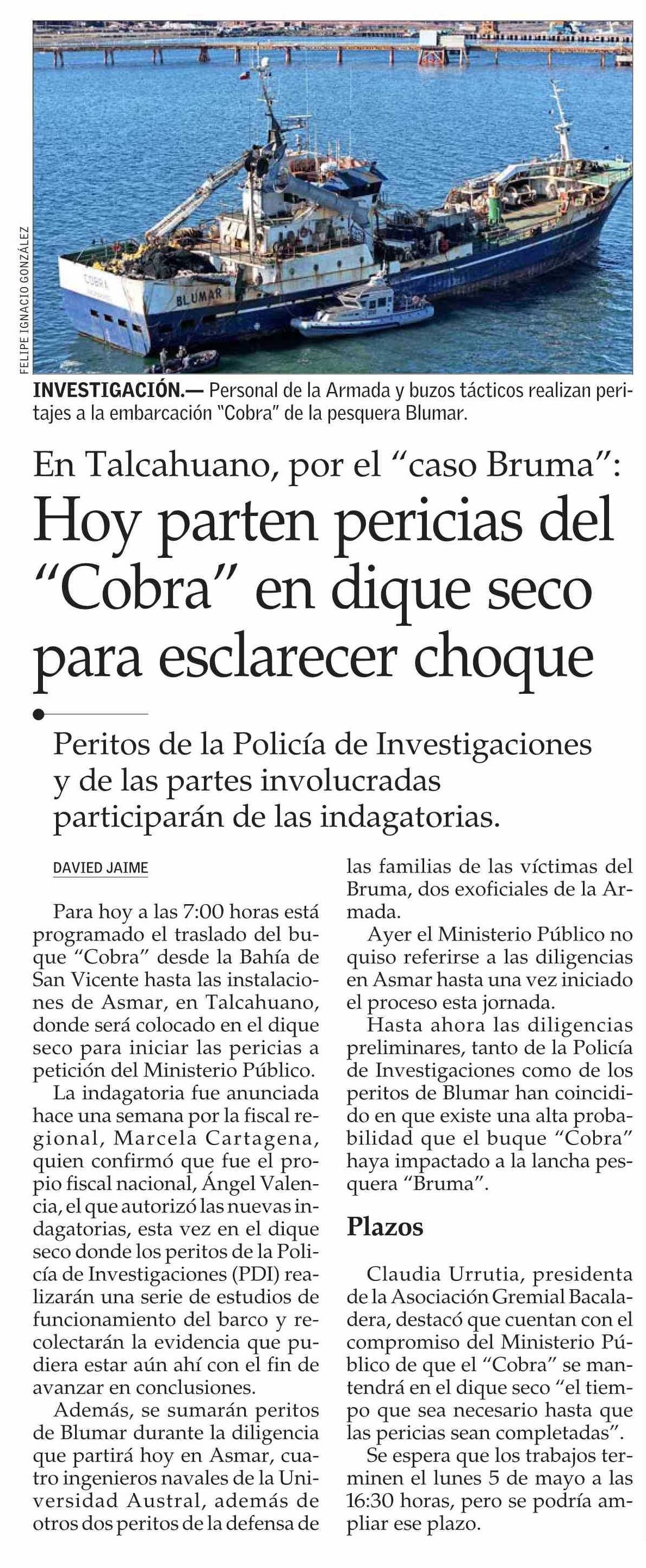 Hoy parten pericias del “Cobra” en dique seco para esclarecer choque 02-05-2025 El Mercurio |