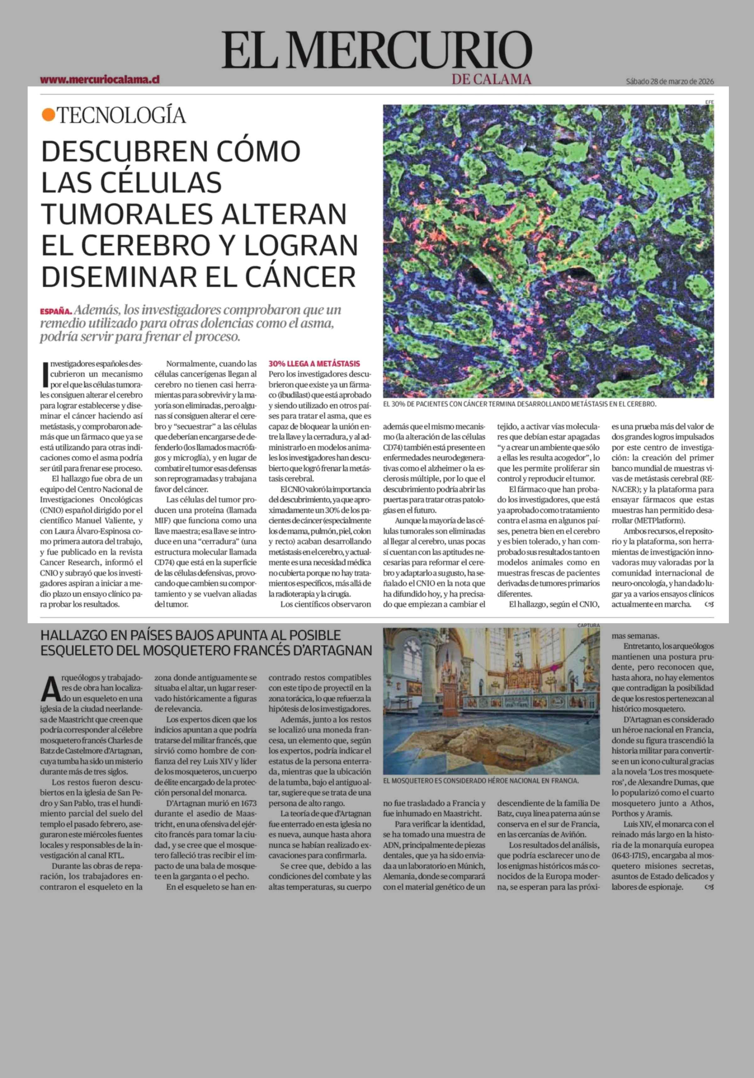 DESCUBREN CÓMO LAS CÉLULAS TUMORALES ALTERAN EL CEREBRO Y LOGRAN DISEMINAR EL CÁNCER 28-03-2026 El Mercurio de Calama |