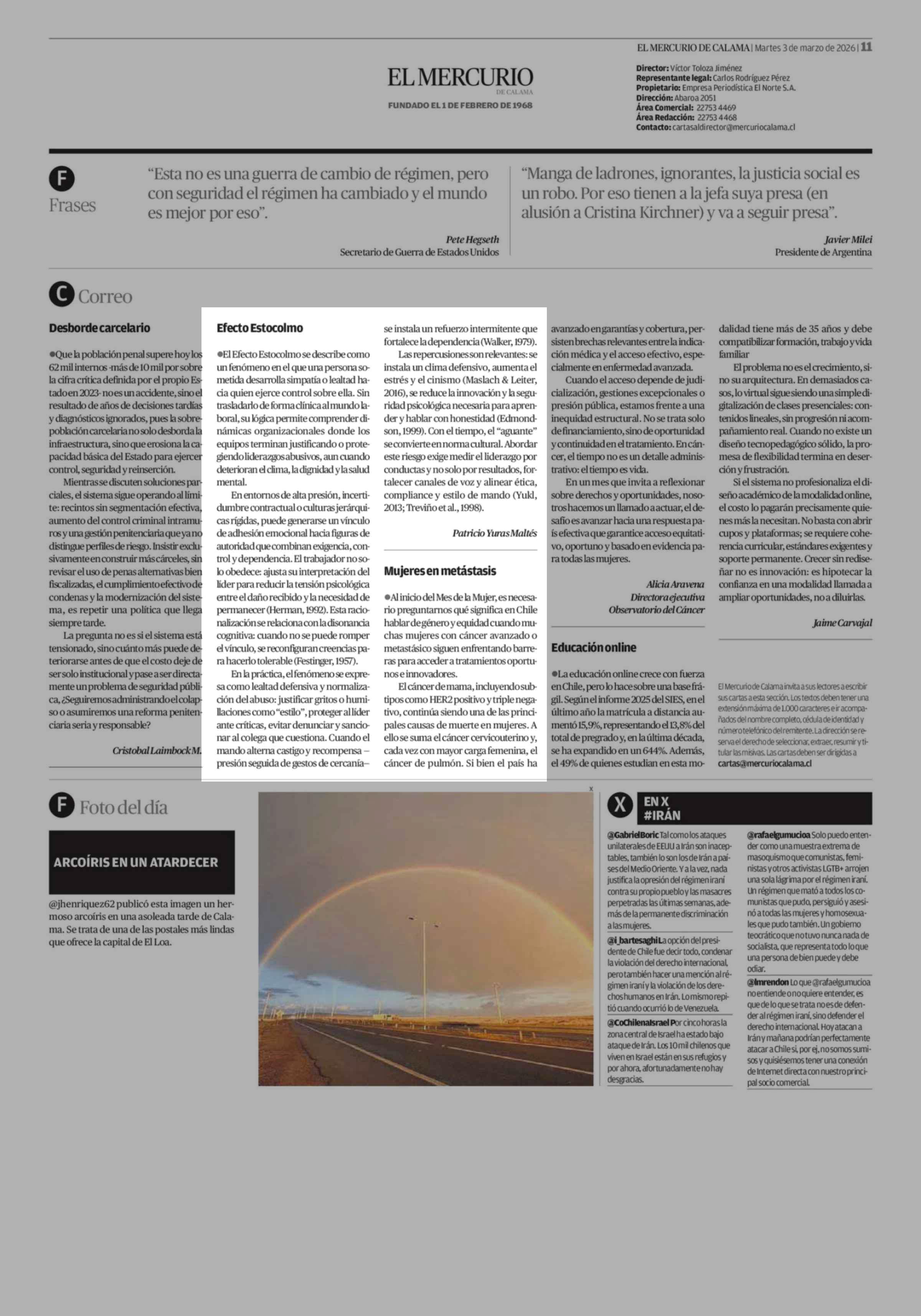 Cartas: Efecto Estocolmo 03-03-2026 El Mercurio de Calama |