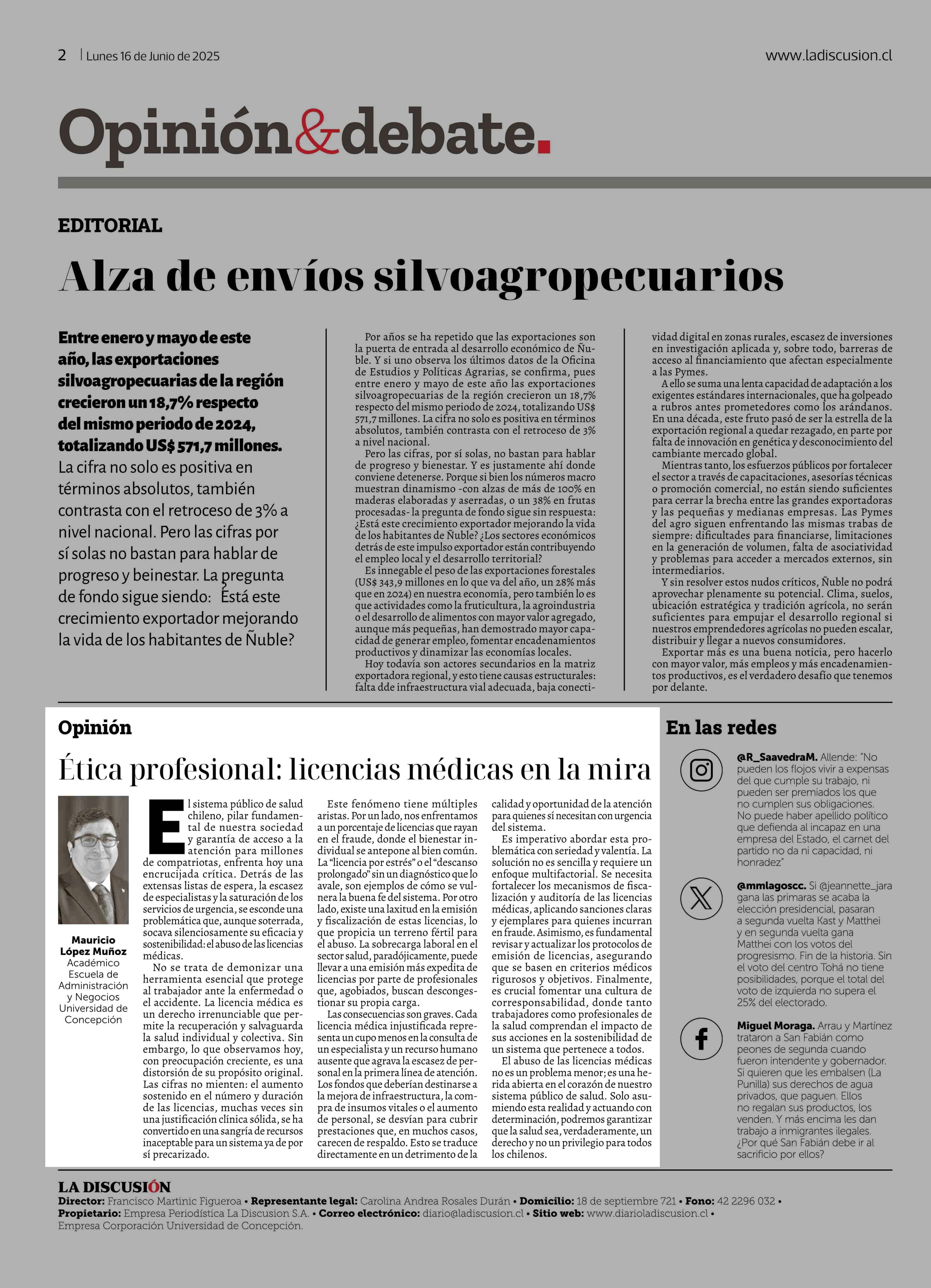 COLUMNAS DE OPINIÓN: Ética profesional: licencias médicas en la mira 16-06-2025 La Discusión |