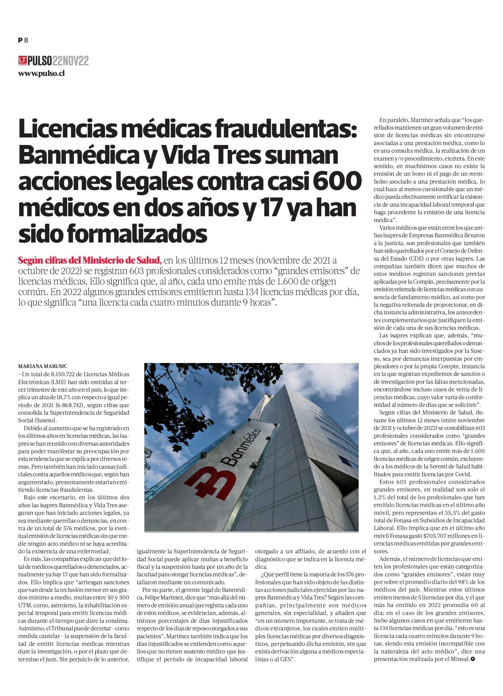 Licencias médicas fraudulentas: Banmédica y Vida Tres suman acciones legales contra casi 600 médicos en dos años y 17 ya han sido formalizados 22-11-2022 La Tercera |