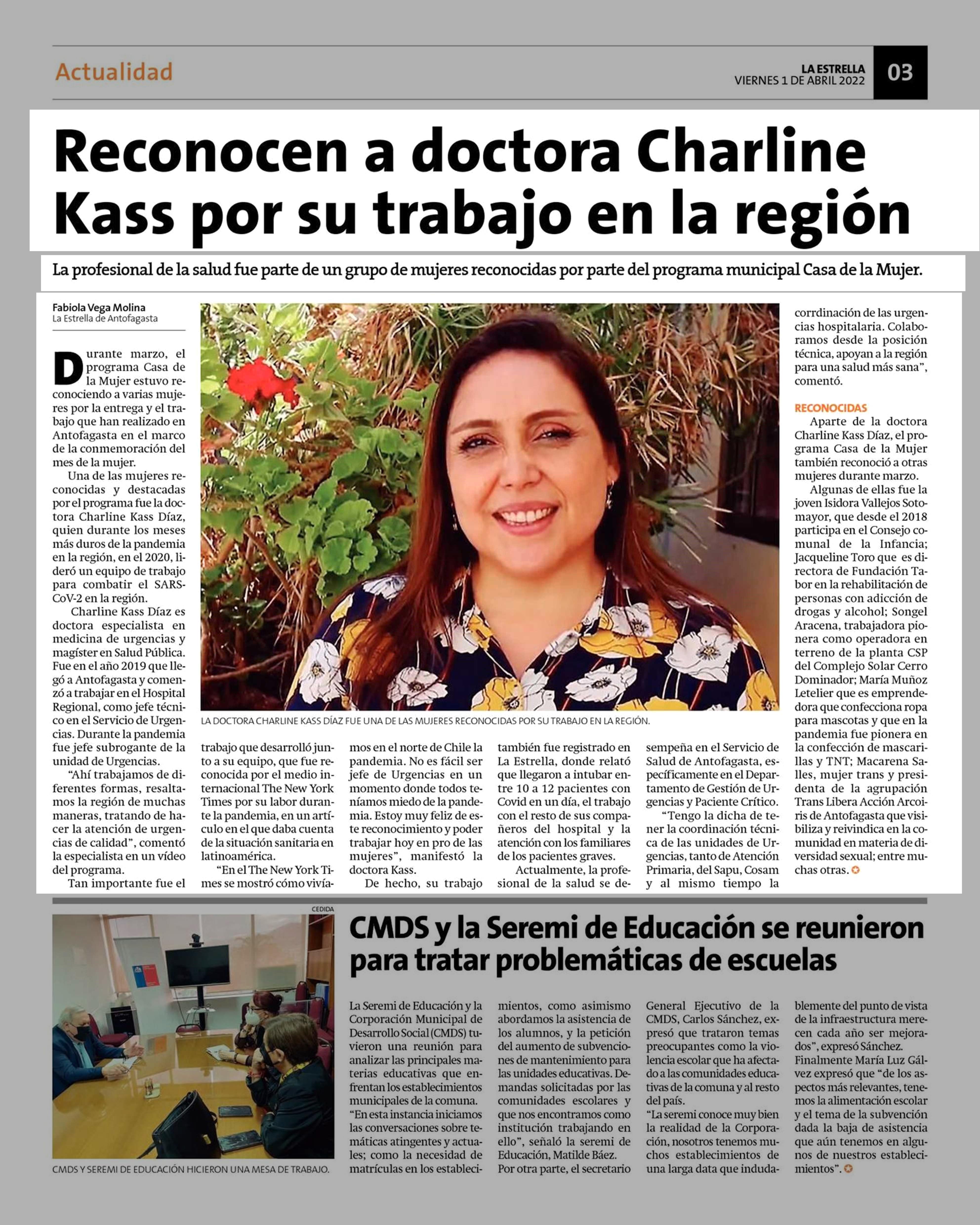 Título: Reconocen a doctora Charline Kass por su trabajo en la región