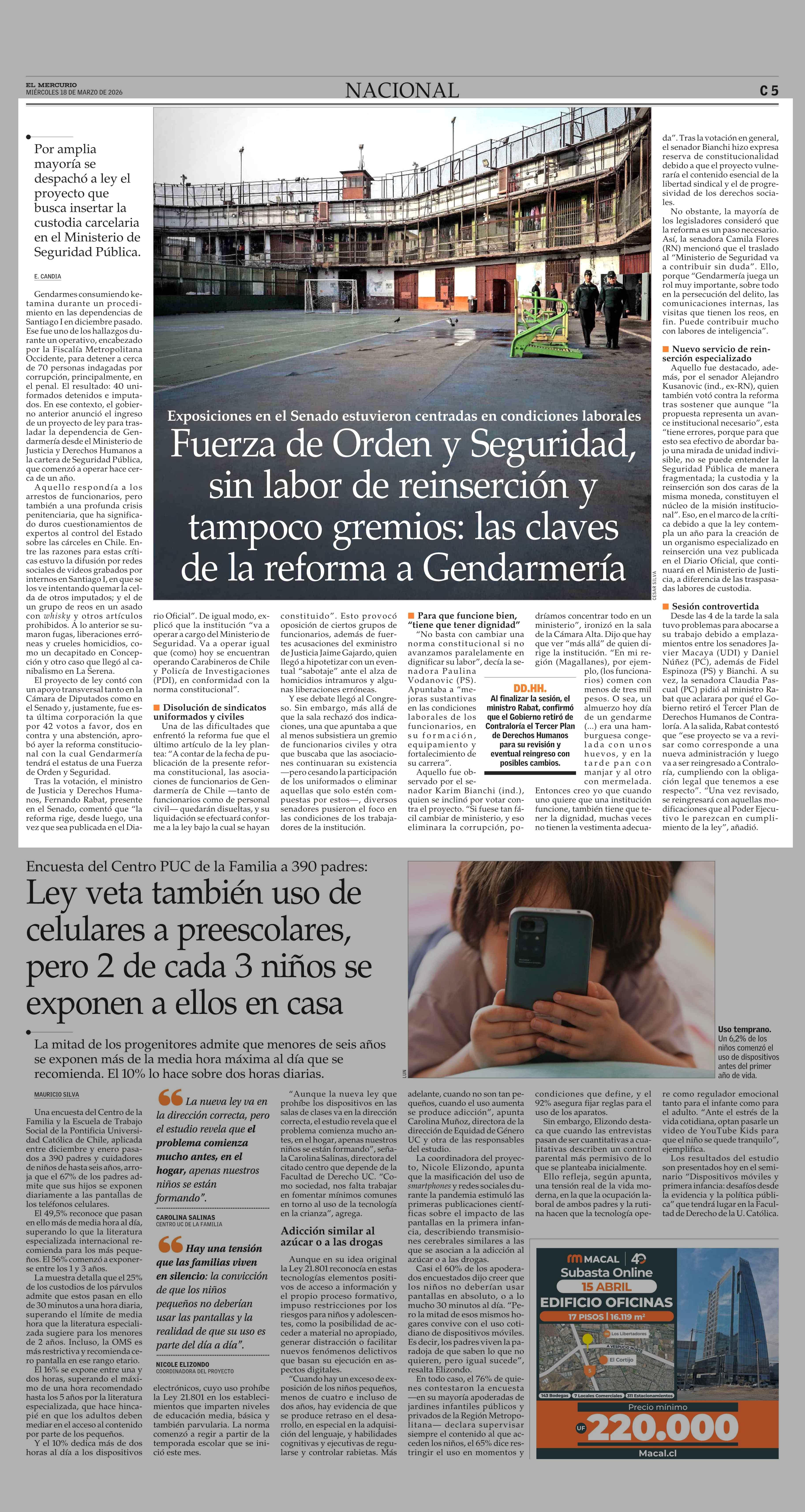 Fuerza de Orden y Seguridad, sin labor de reinserción y tampoco gremios: las claves de la reforma a Gendarmería 18-03-2026 El Mercurio |