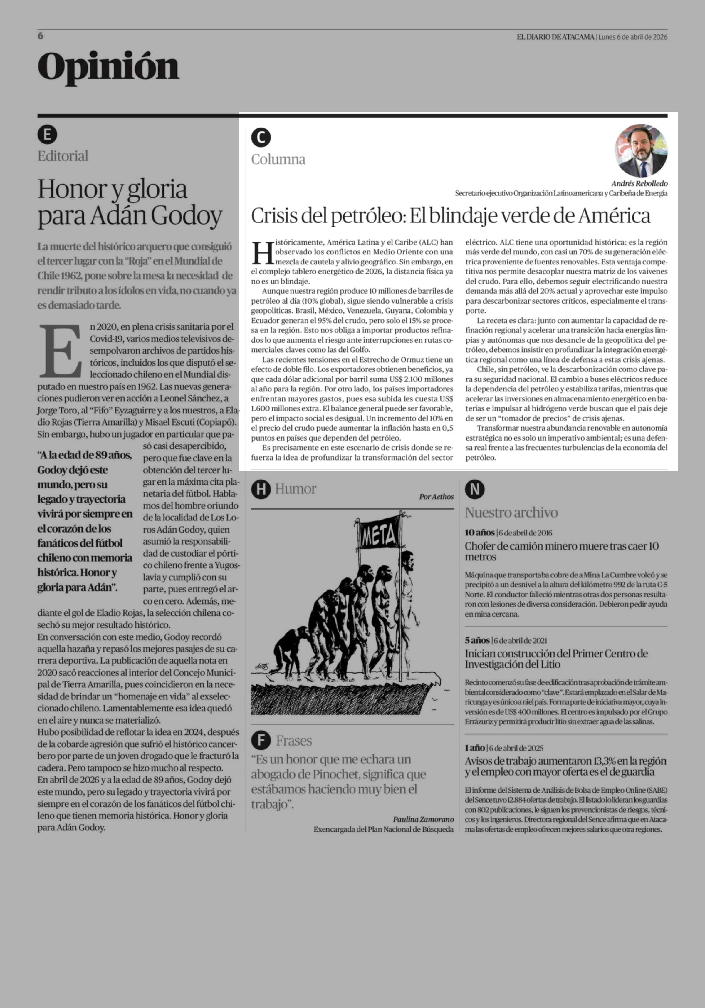 Columnas de Opinión: Crisis del petróleo: El blindaje verde de América 06-04-2026 El Diario de Atacama |