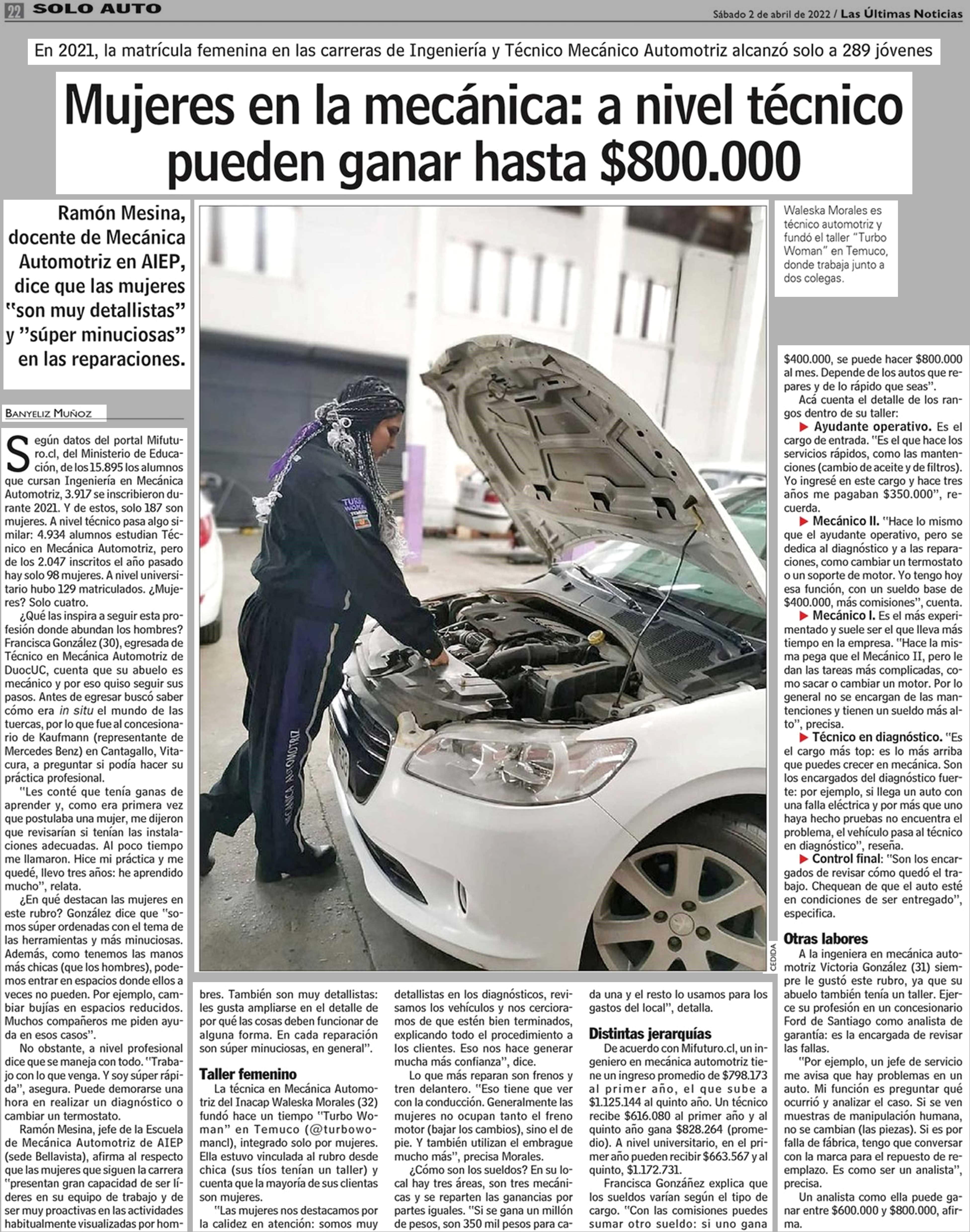 Mujeres en la mecánica: a nivel técnico pueden ganar hasta $800.000 02-04-2022 Las Últimas Noticias |