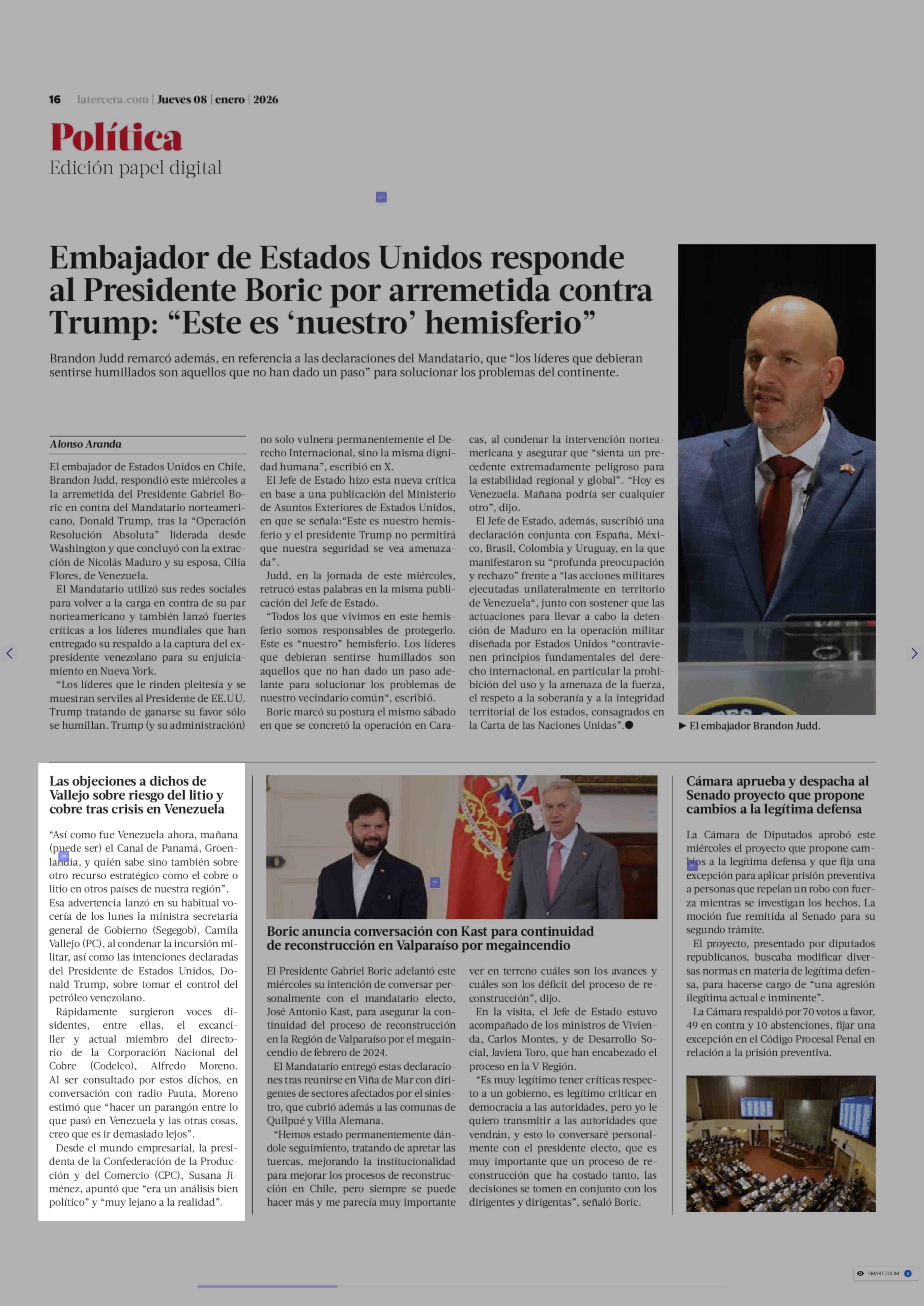 Las objeciones a dichos de Vallejo sobre riesgo del litio y cobre tras crisis en Venezuela 08-01-2026 La Tercera |