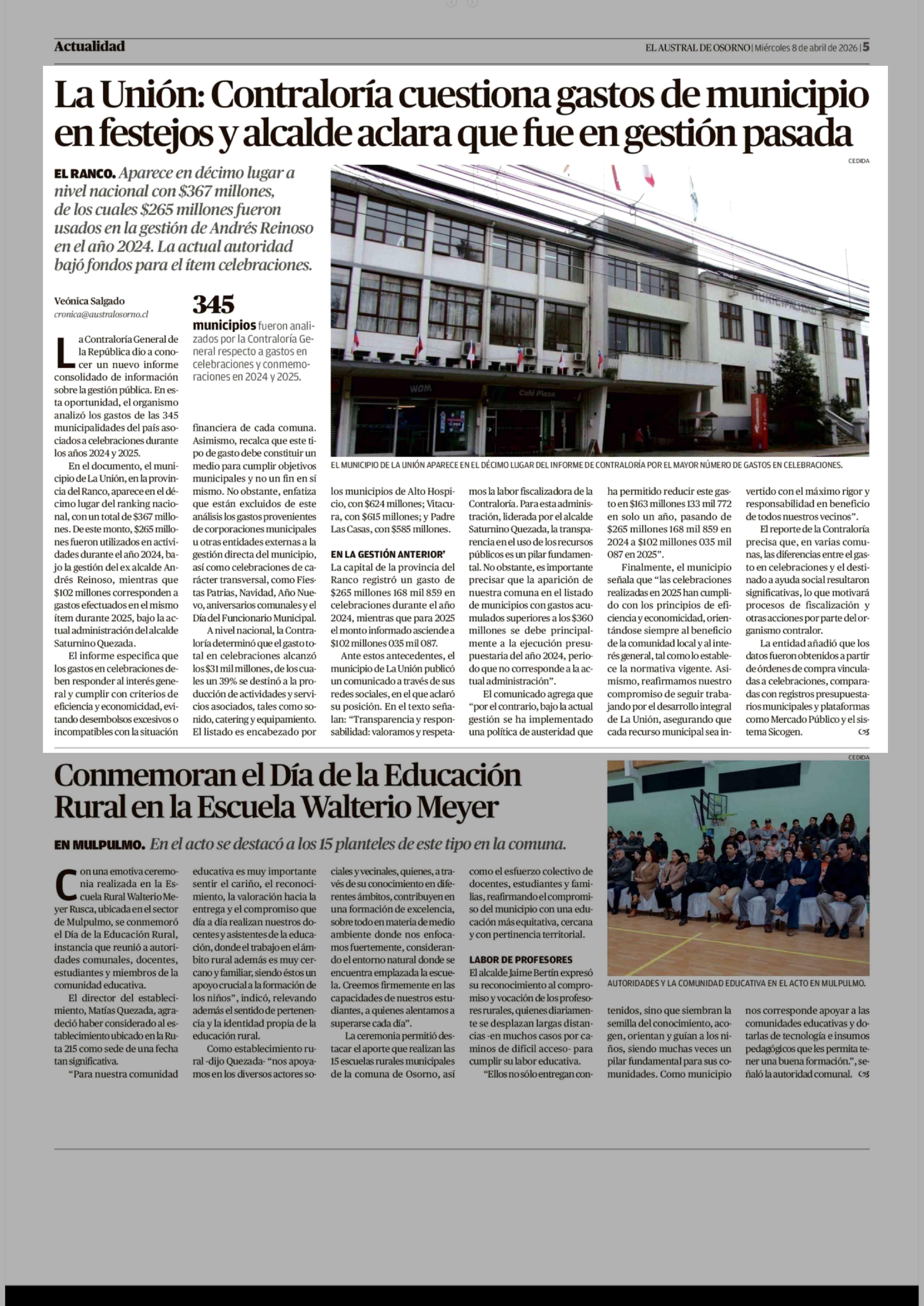 La Unión: Contraloría cuestiona gastos de municipio en festejos y alcalde aclara que fue en gestión pasada 08-04-2026 El Austral de Osorno |