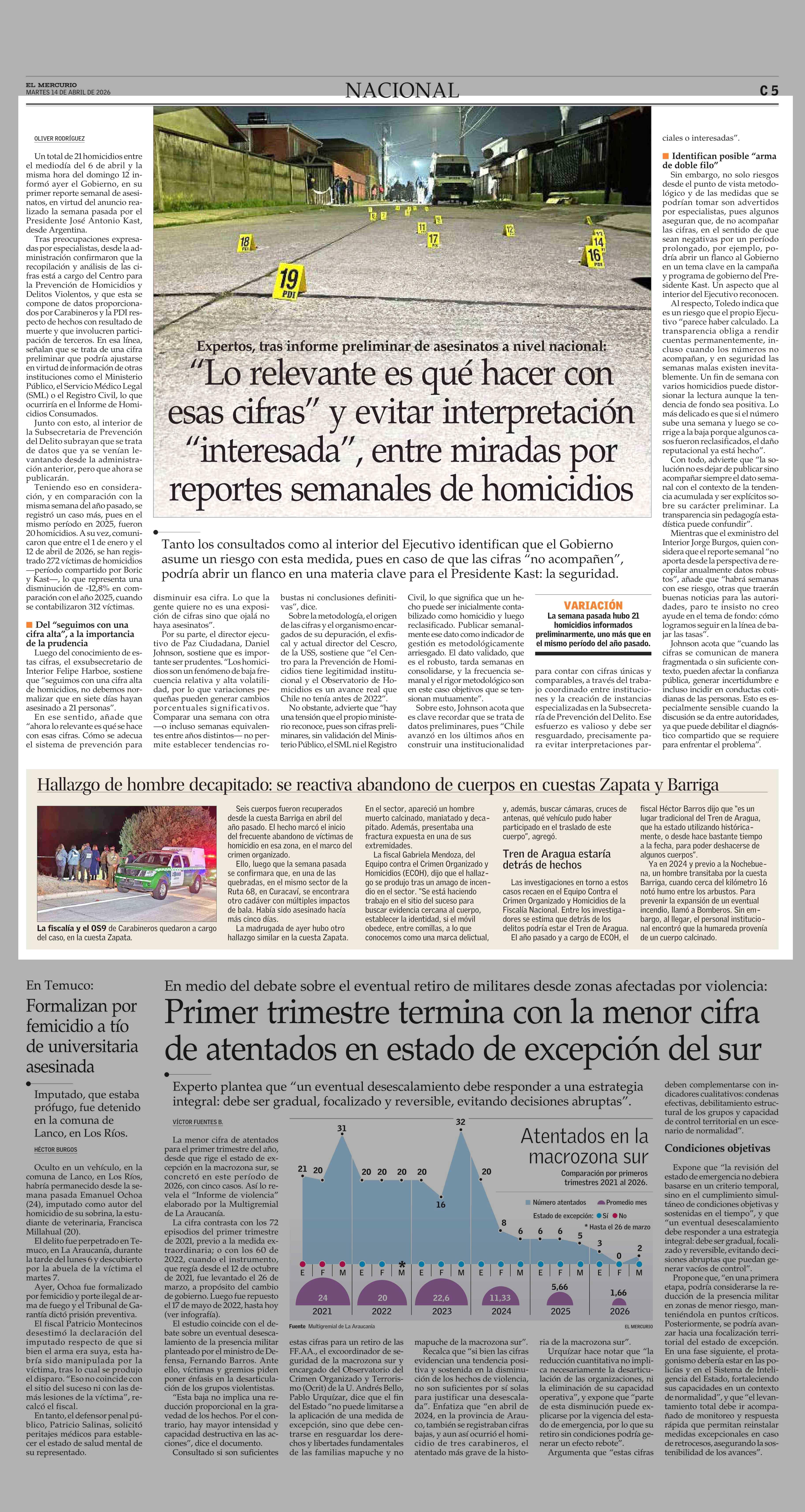 “Lo relevante es qué hacer con esas cifras” y evitar interpretación “interesada”, entre miradas por reportes semanales de homicidios 14-04-2026 El Mercurio |
