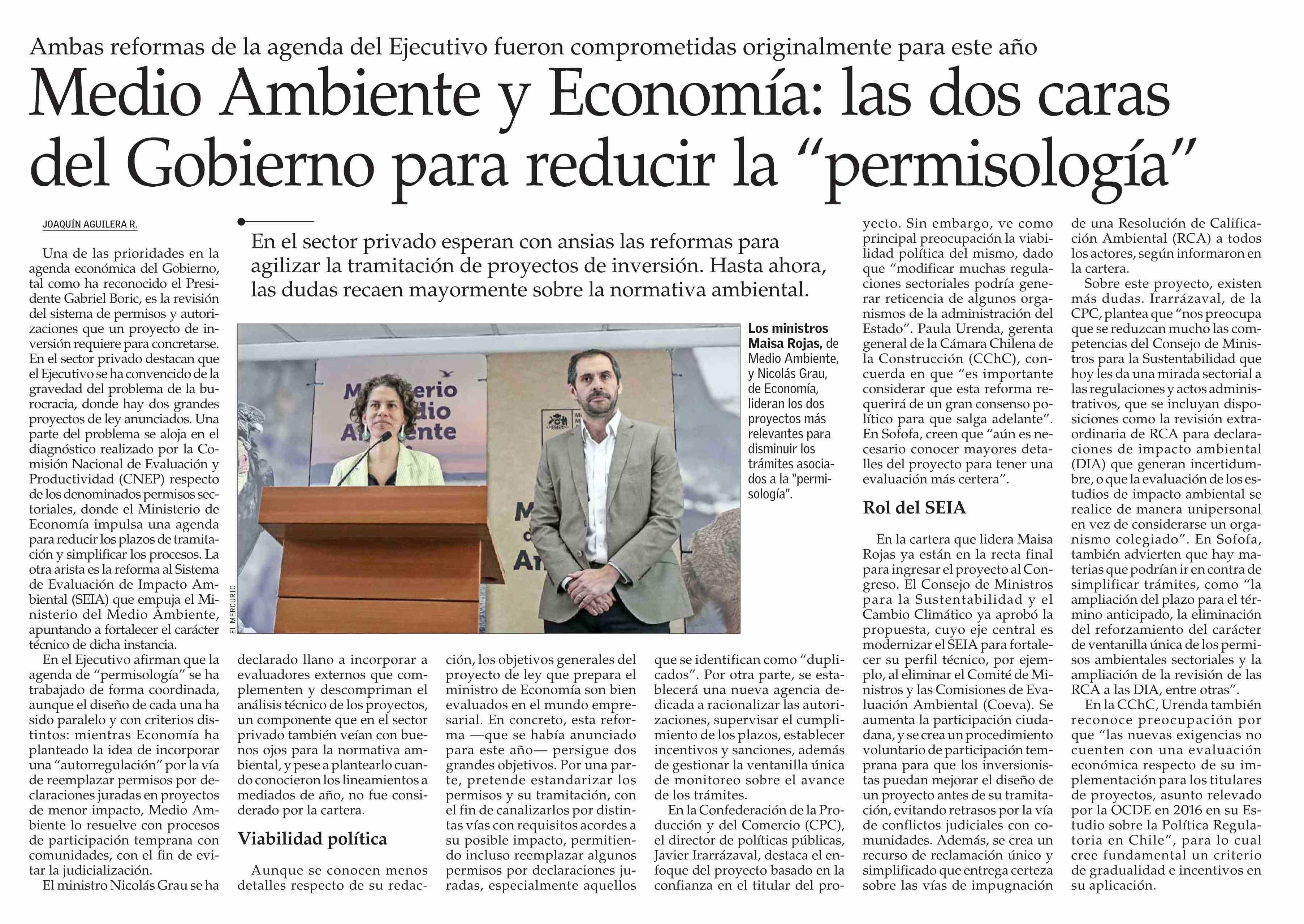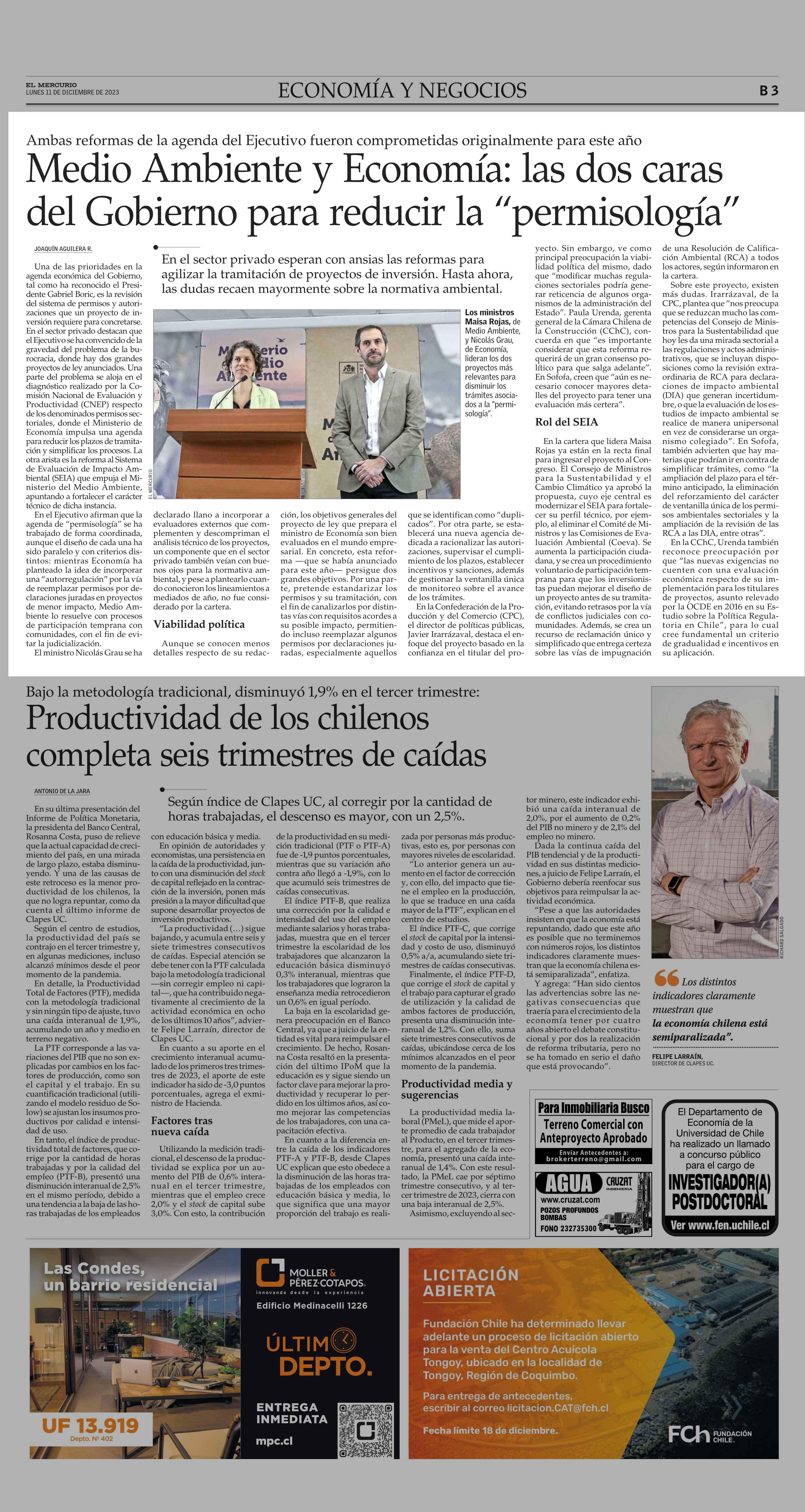 Medio Ambiente y Economía: las dos caras del Gobierno para reducir la "permisología" 11-12-2023 El Mercurio |