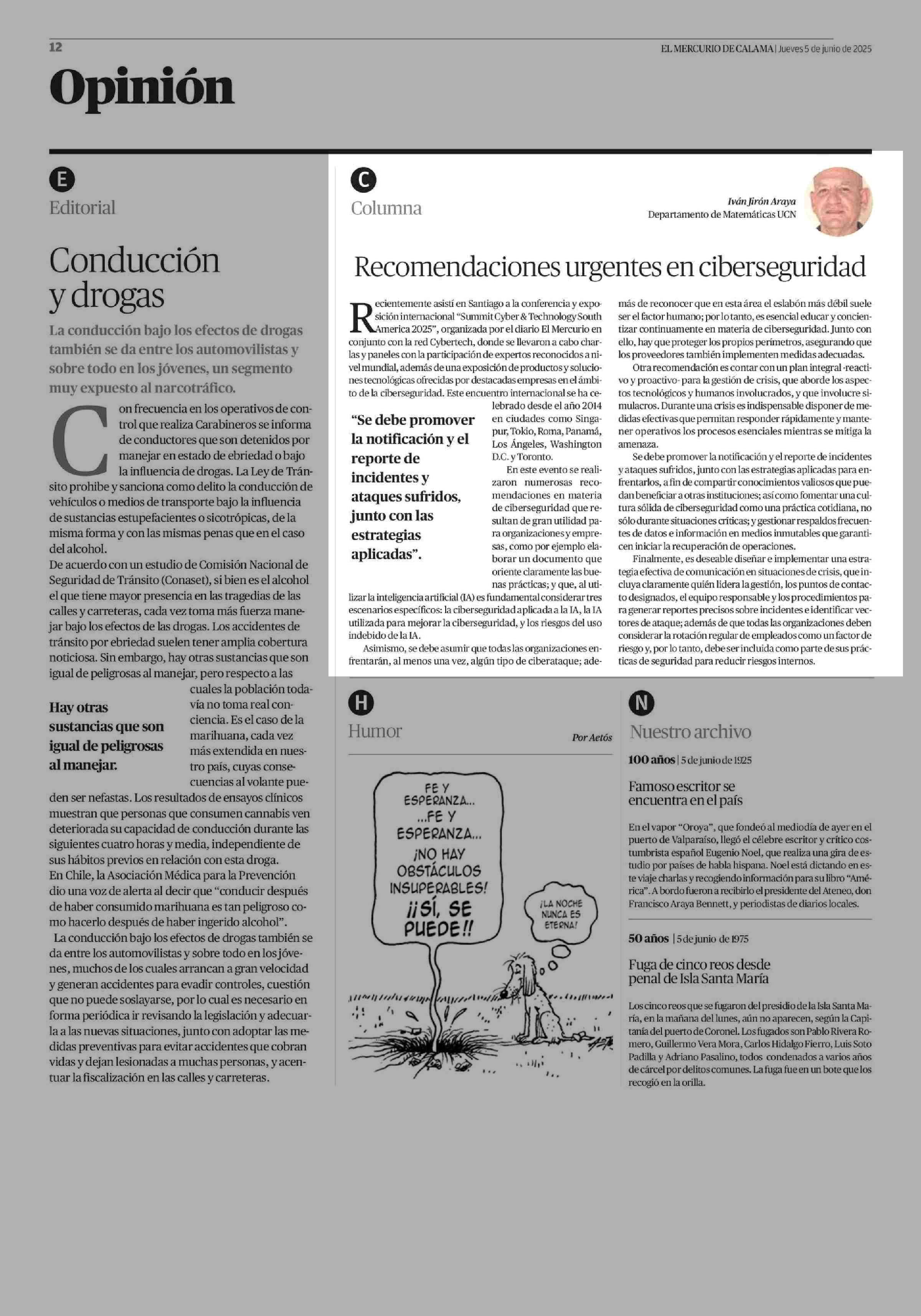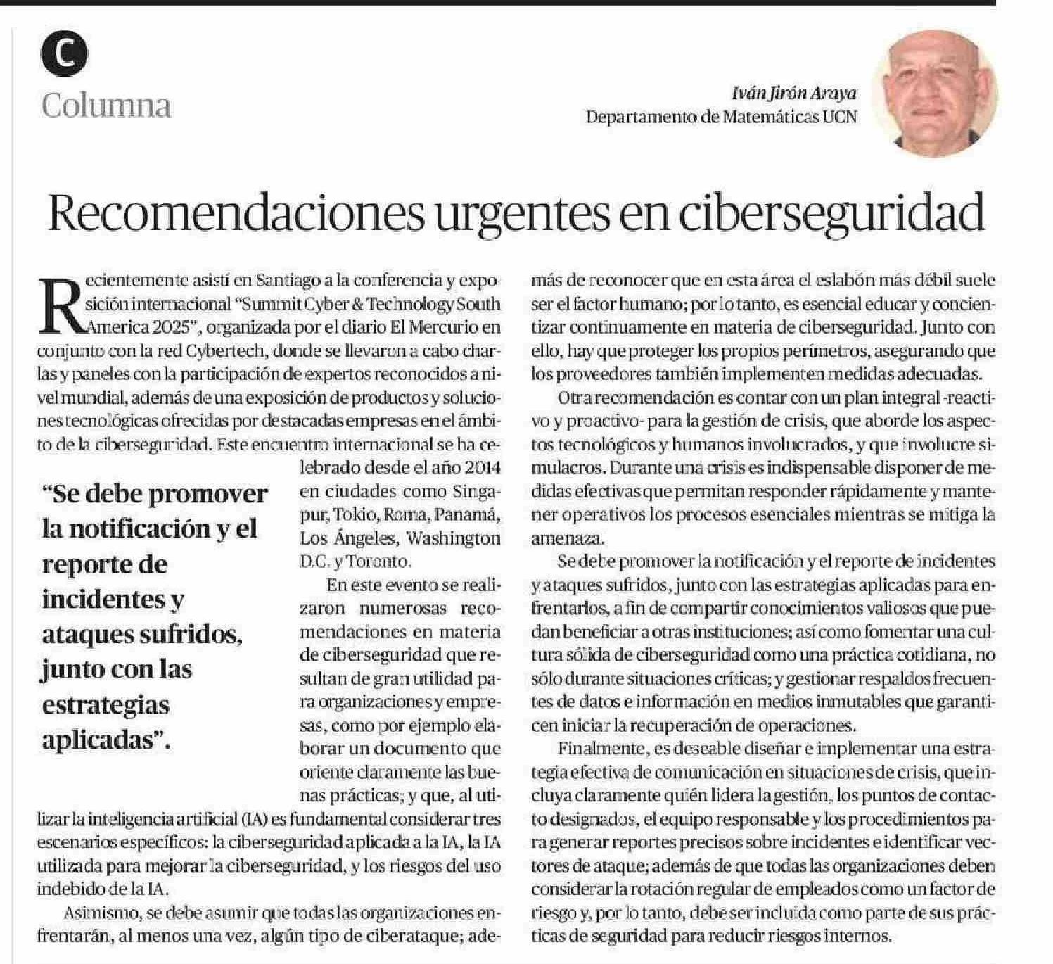 Recomendaciones urgentes en ciberseguridad 05-06-2025 El Mercurio de Calama |