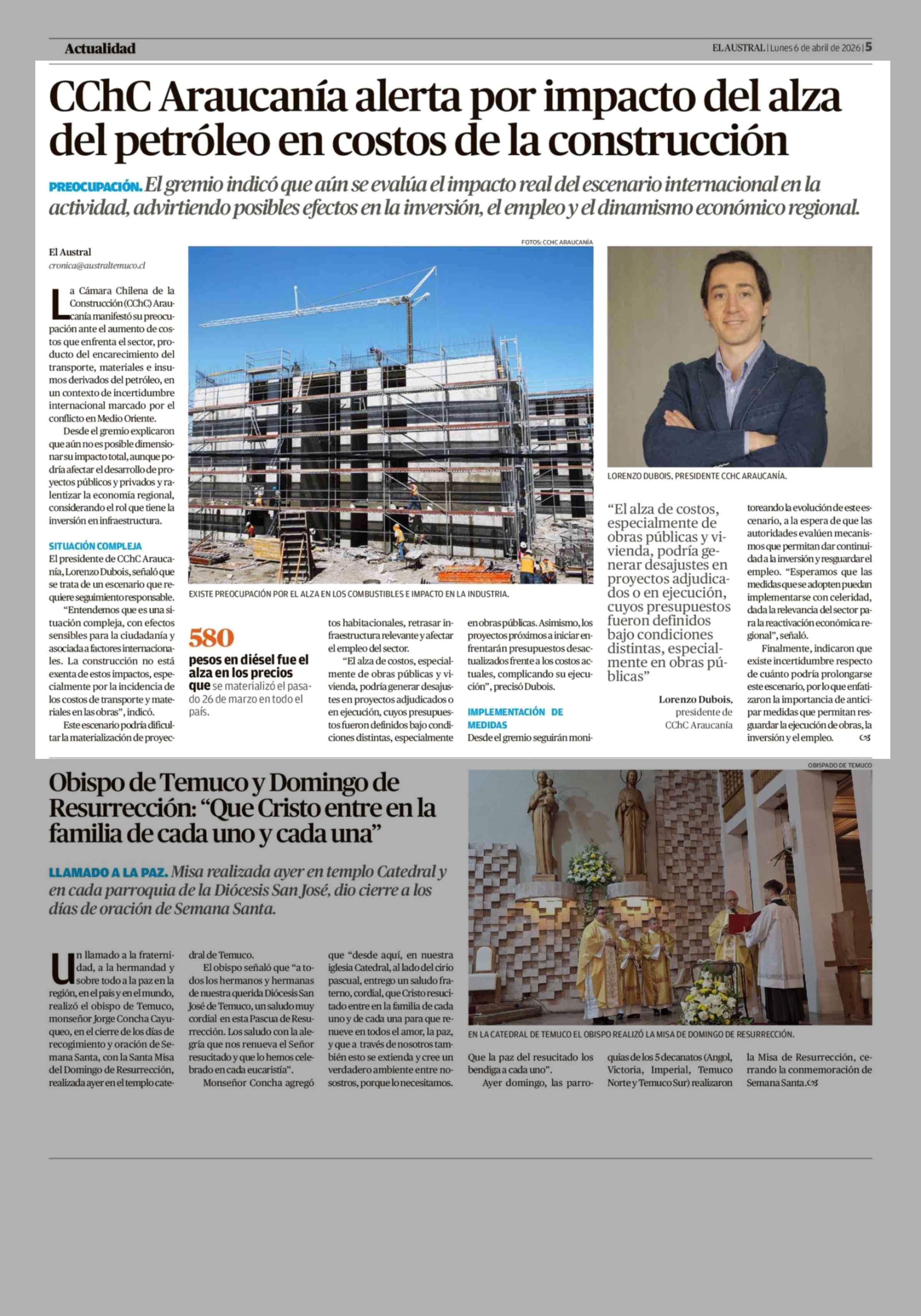 CChC Araucanía alerta por impacto del alza del petróleo en costos de la construcción 06-04-2026 El Austral de la Araucanía |