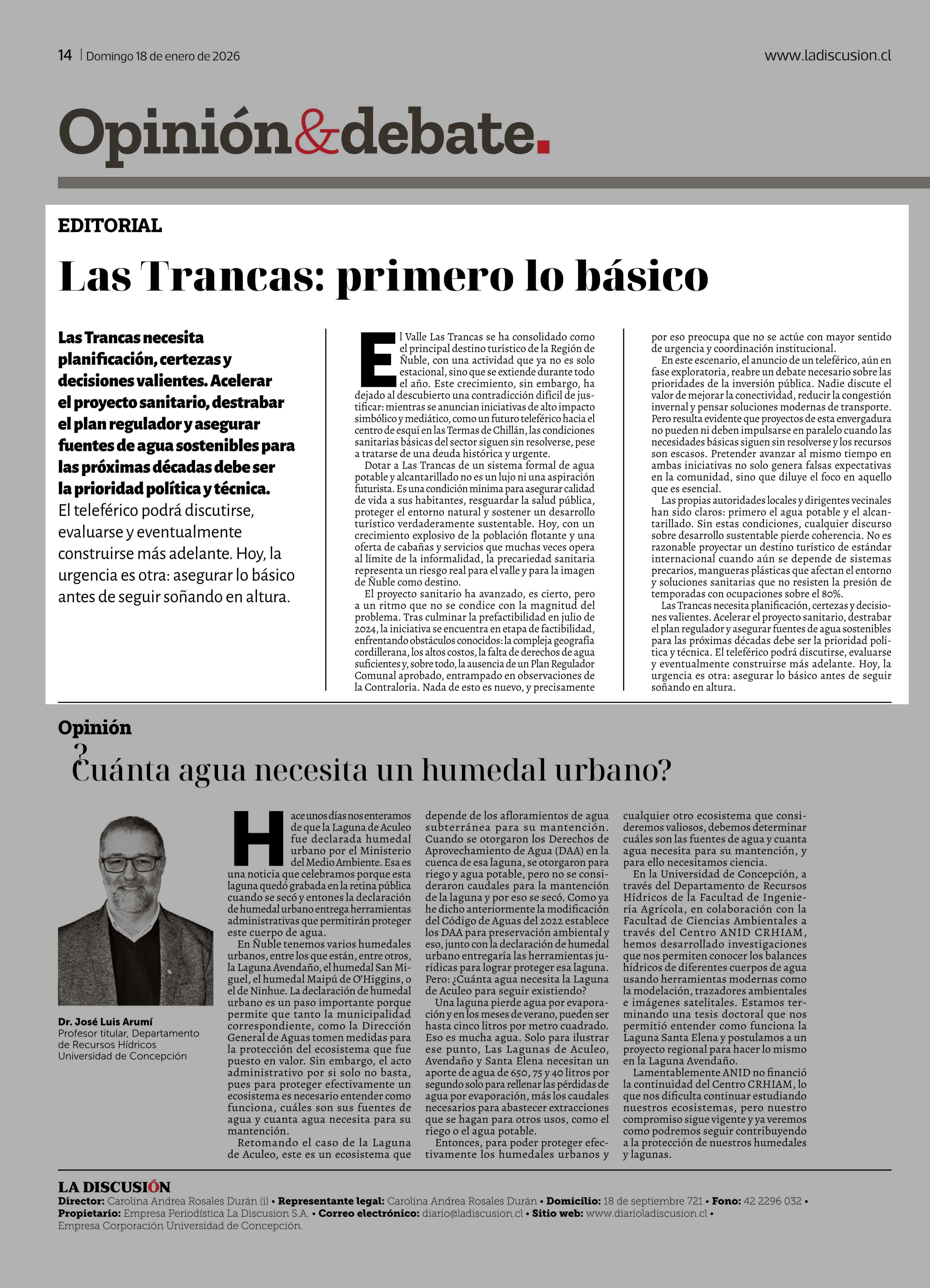 Editorial: Las Trancas: primero lo básico 18-01-2026 La Discusión |