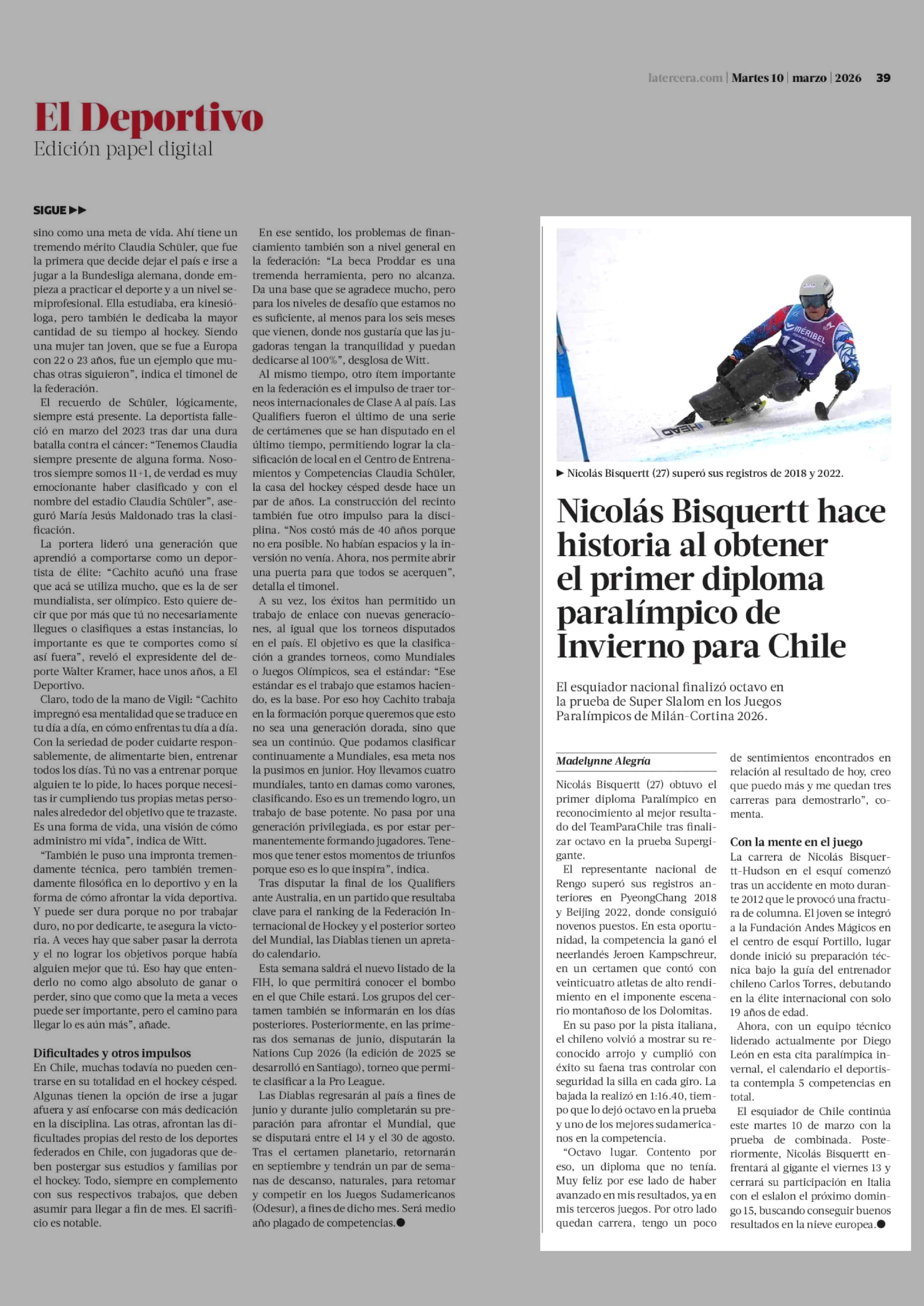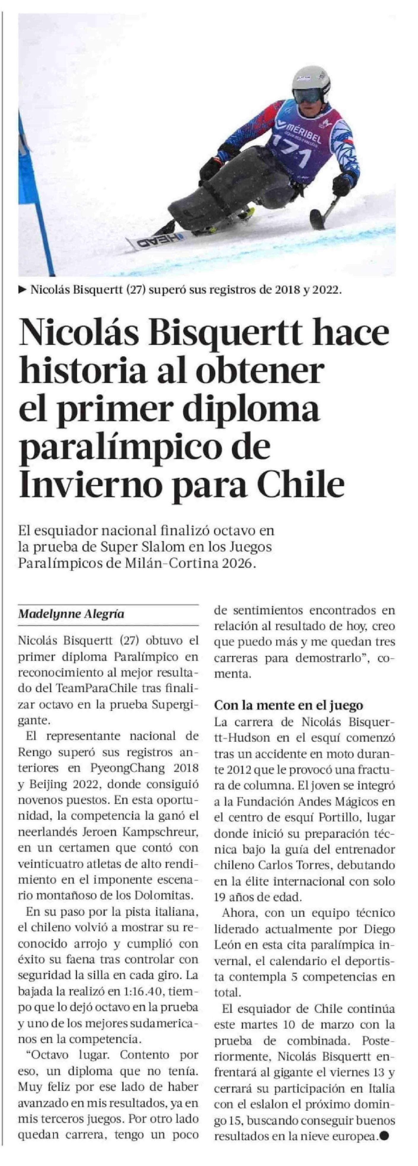 Nicolás Bisquertt hace historia al obtener el primer diploma paralímpico de Invierno para Chile 10-03-2026 La Tercera |