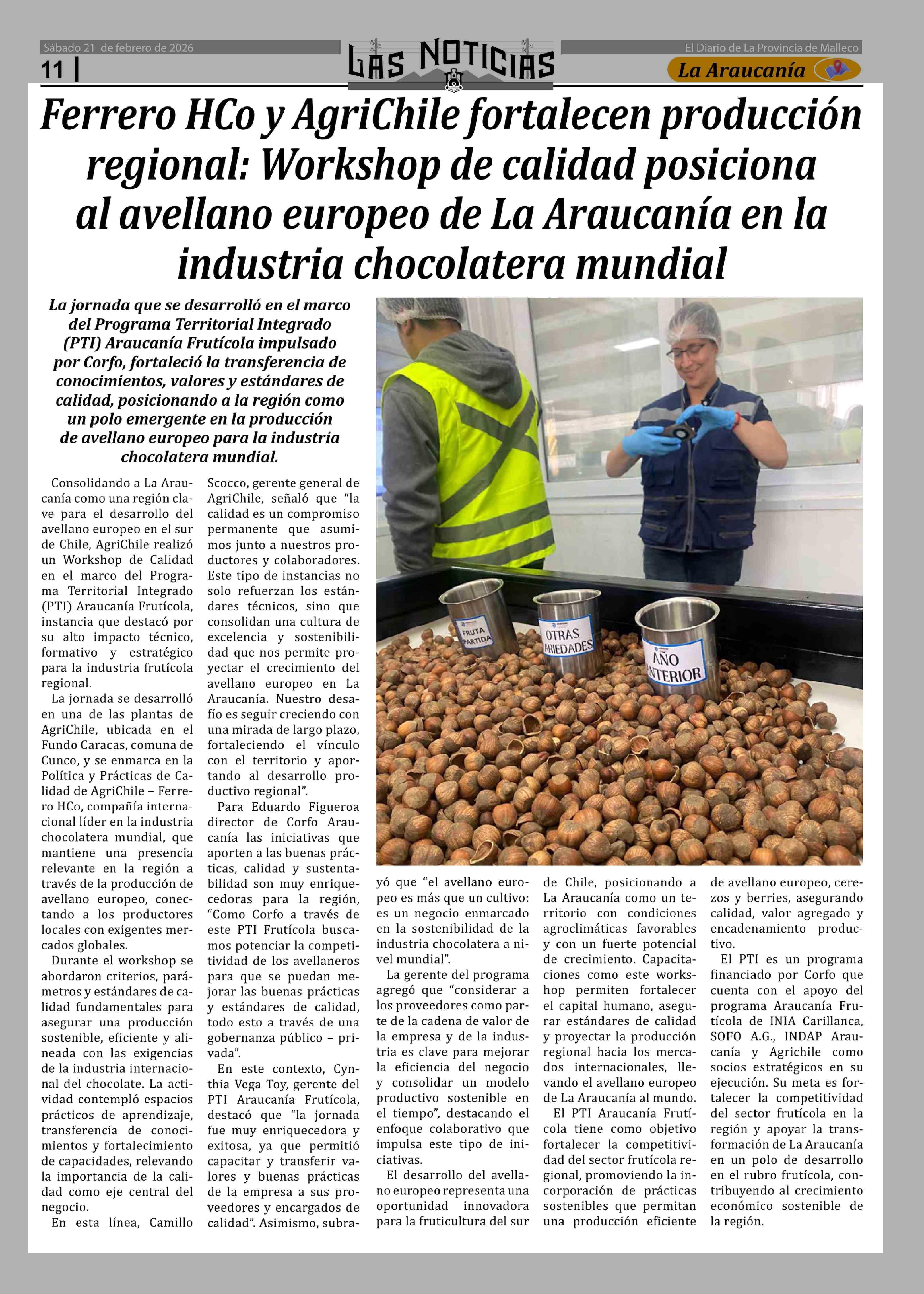 Ferrero HCo y AgriChile fortalecen producción regional: Workshop de calidad posiciona al avellano europeo de La Araucanía en la industria chocolatera mundial 21-02-2026 Las Noticias |