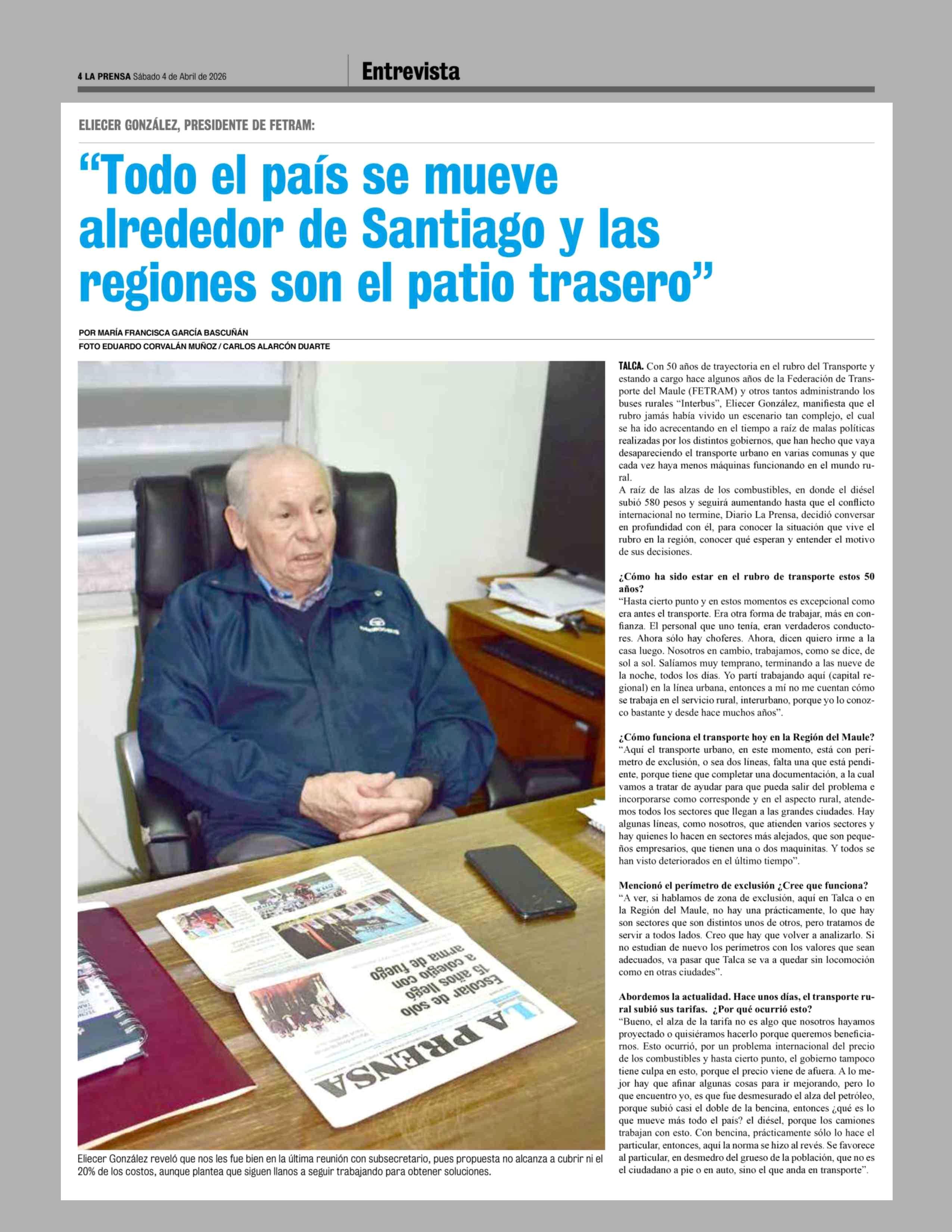 "Todo el país se mueve alrededor de Santiago y las regiones son el patio trasero" 04-04-2026 La Prensa de Curicó |
