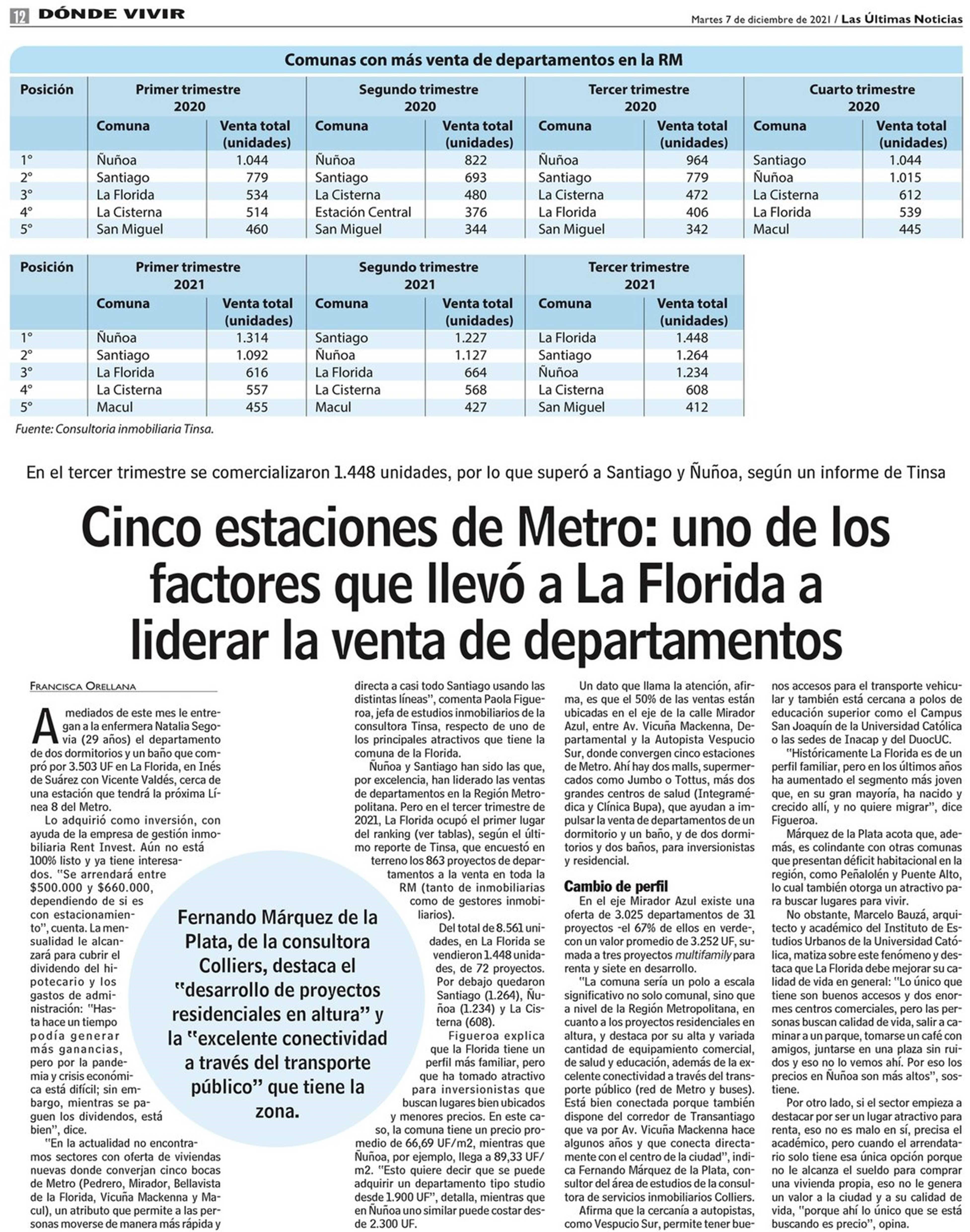 Cinco estaciones de Metro: uno de los factores que llevó a La Florida a liderar la venta de departamentos 07-12-2021 Las Últimas Noticias |