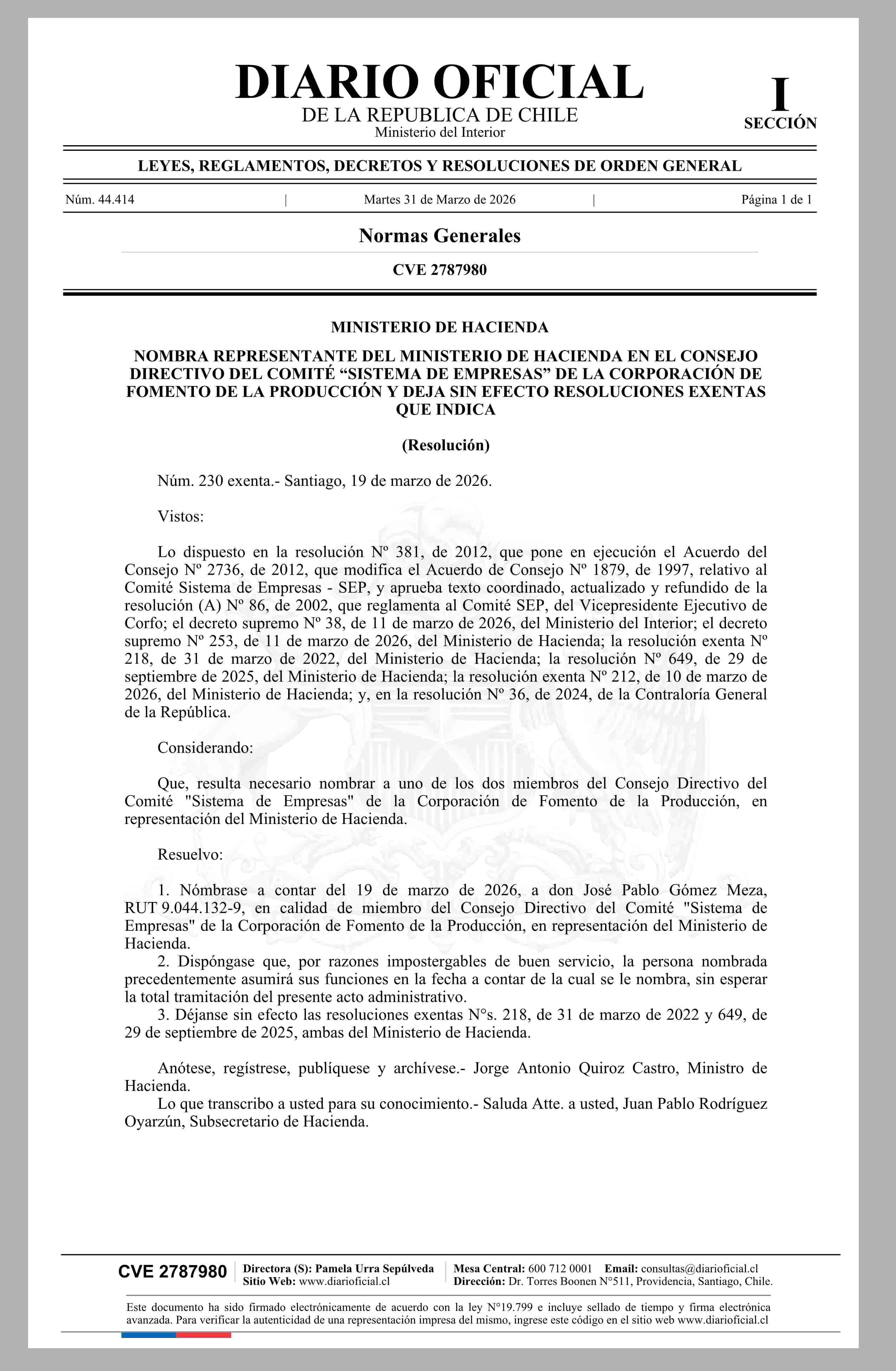 | Título: | MINISTERIO DE HACIENDA NOMBRA REPRESENTANTE DEL MINISTERIO DE HACIENDA EN EL CONSEJO DIRECTIVO DEL COMITÉ “SISTEMA DE EMPRESAS” DE LA CORPORACIÓN DE FOMENTO DE LA PRODUCCIÓN Y DEJA SIN EFECTO RESOLUCIONES EXENTAS QUE INDICA |